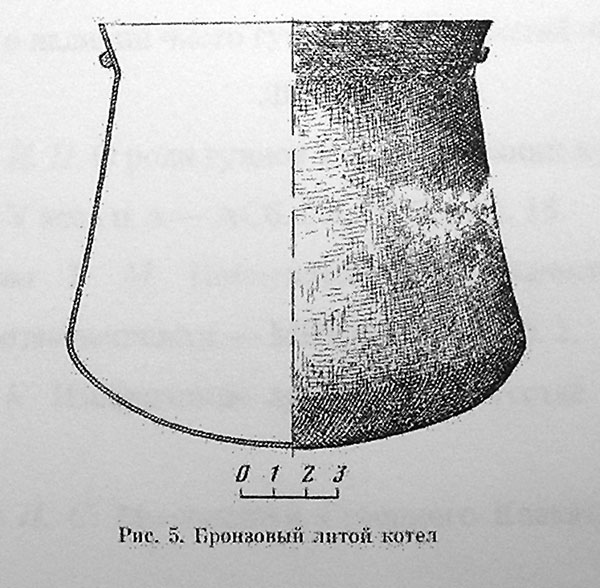 В ногах погребёного, справа, стоял бронзовый литой котёл, один бок которого деформирован (рис.5). Котёл грушевидной формы, края сильно отогнуты наружу. С двух сторон на краях видны остатки оснований железной ручки. Высота котла 14,5 см, диаметр максимального расширения тулова 15, диаметр устья 14 см.