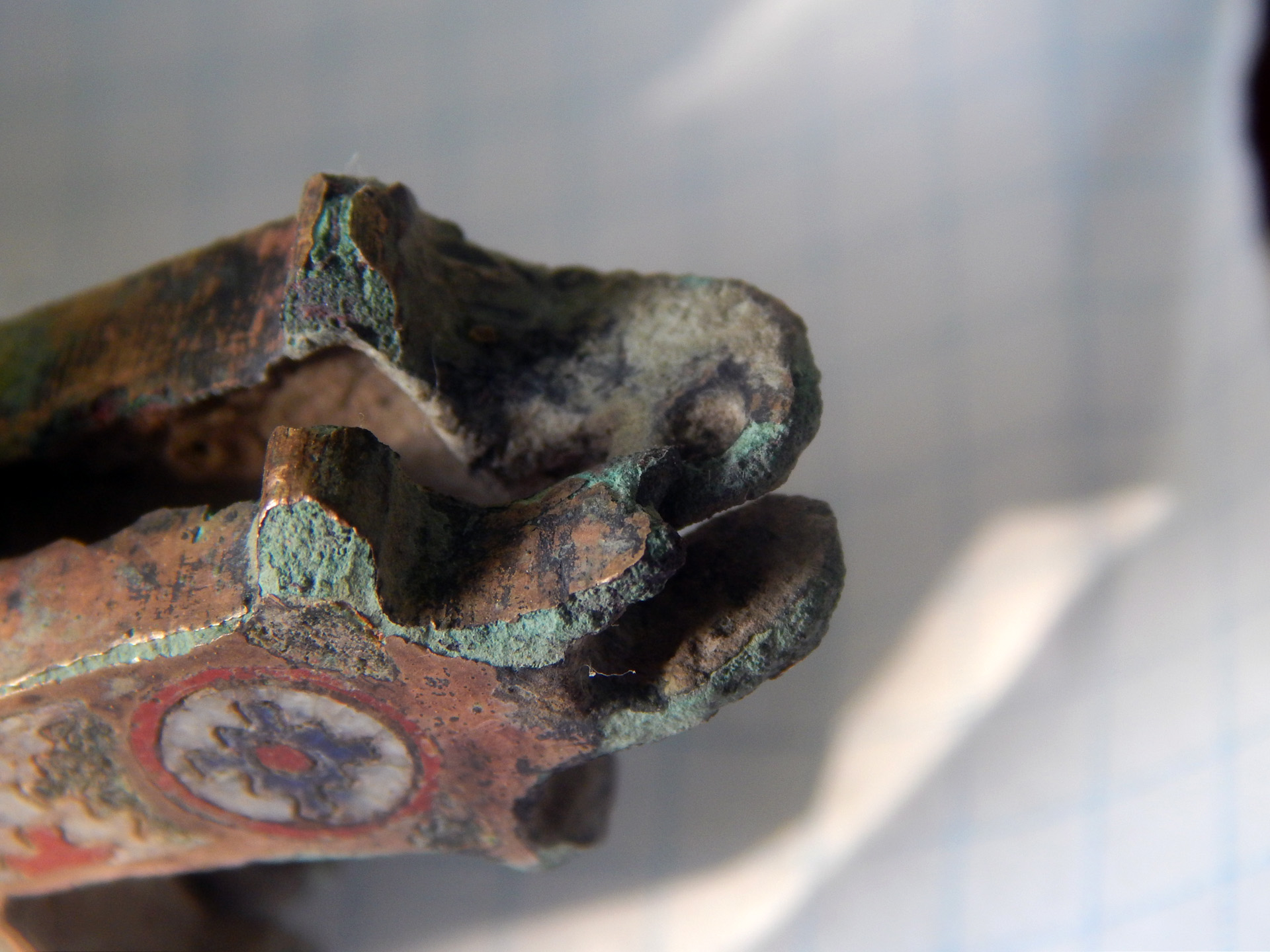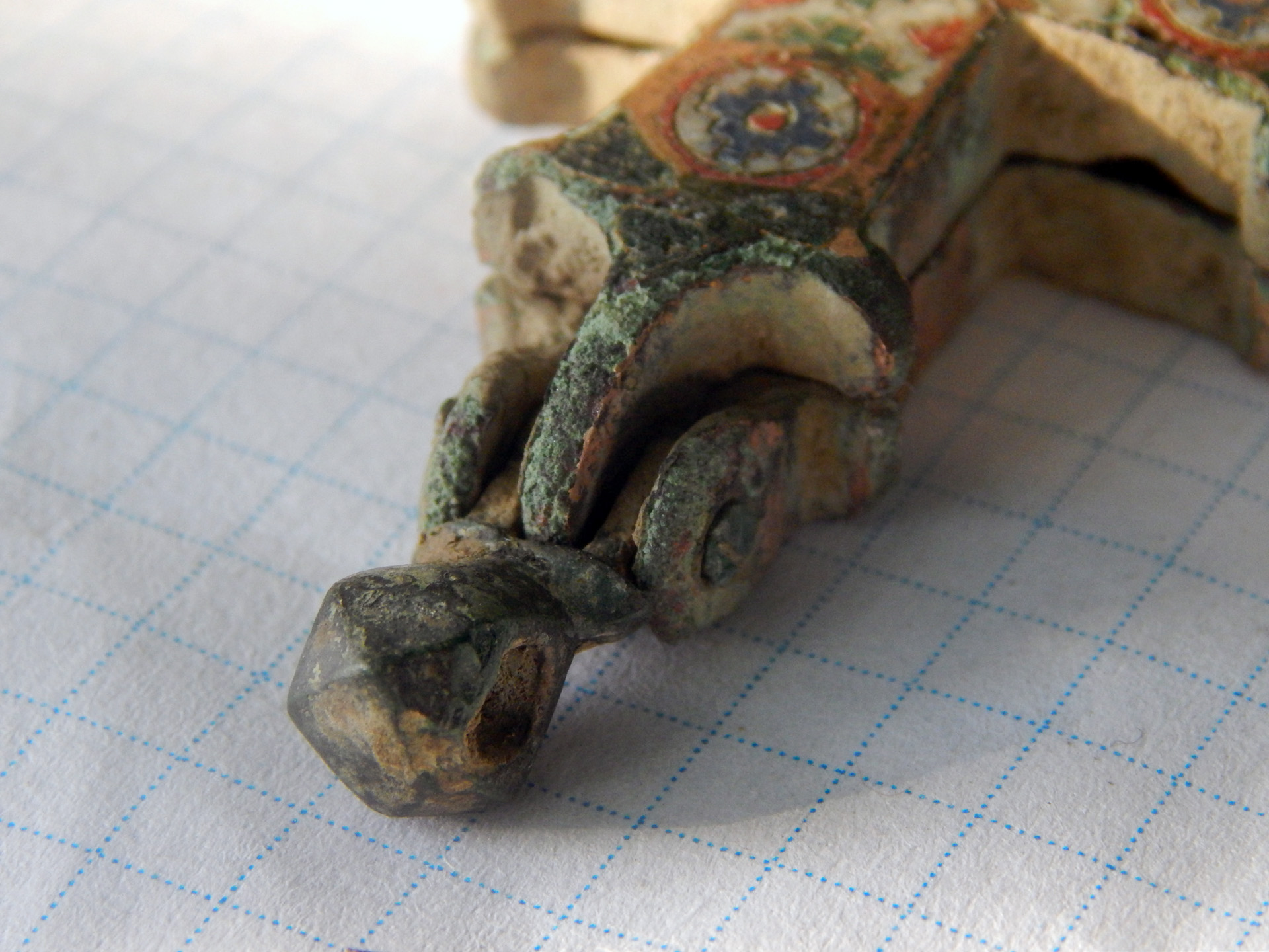 «с перегородчатой эмалью». Наружные края выемок сохранили позолоту, вероятно