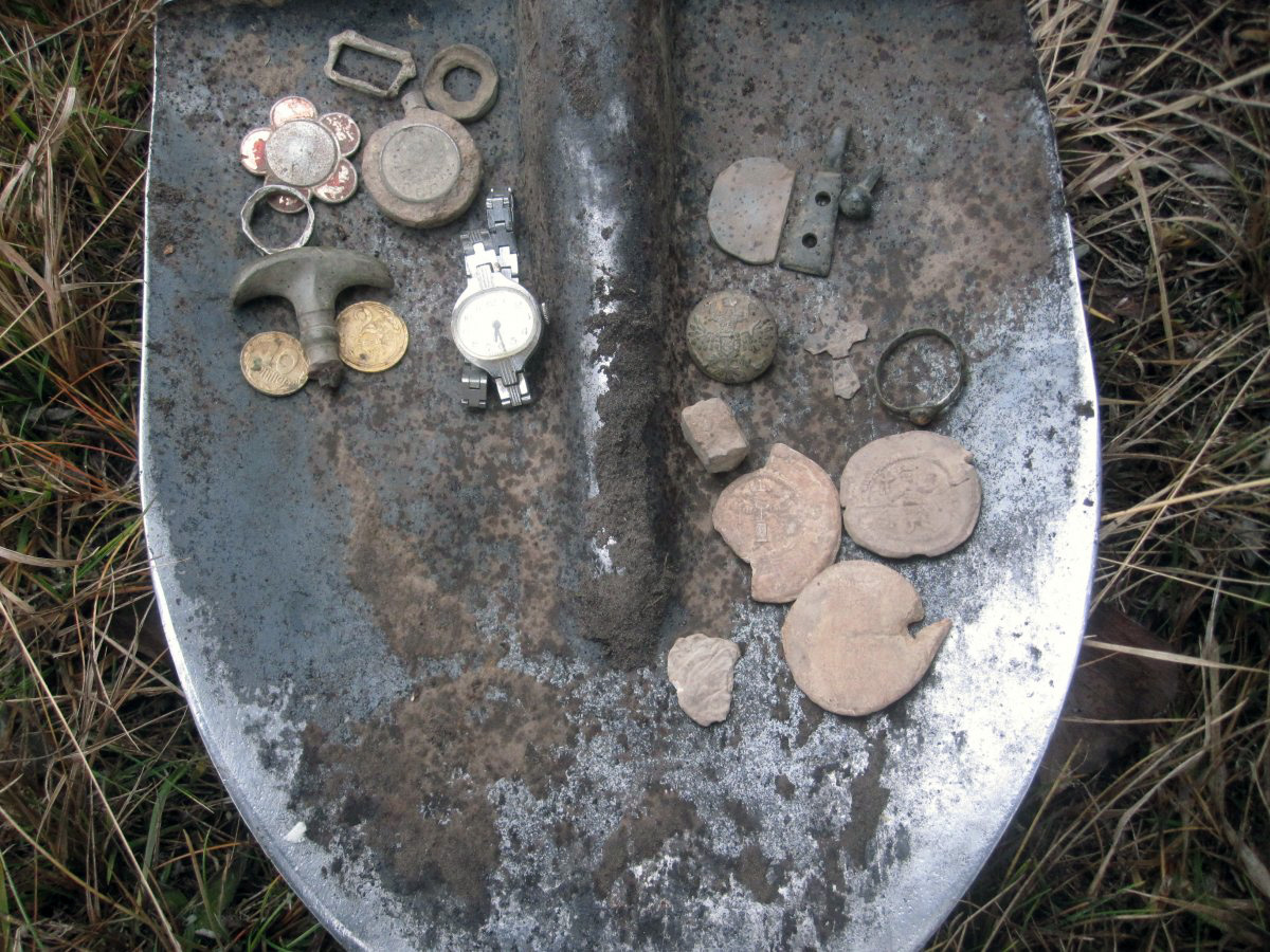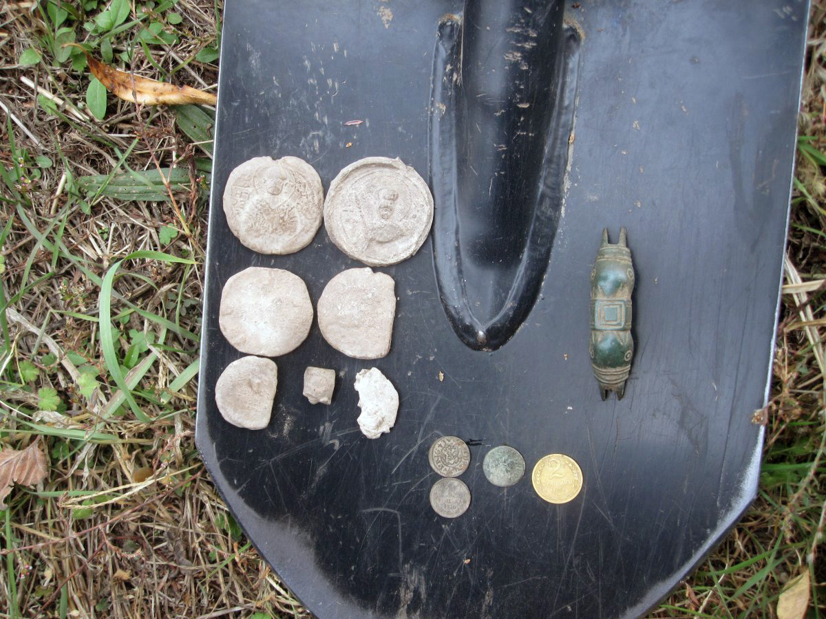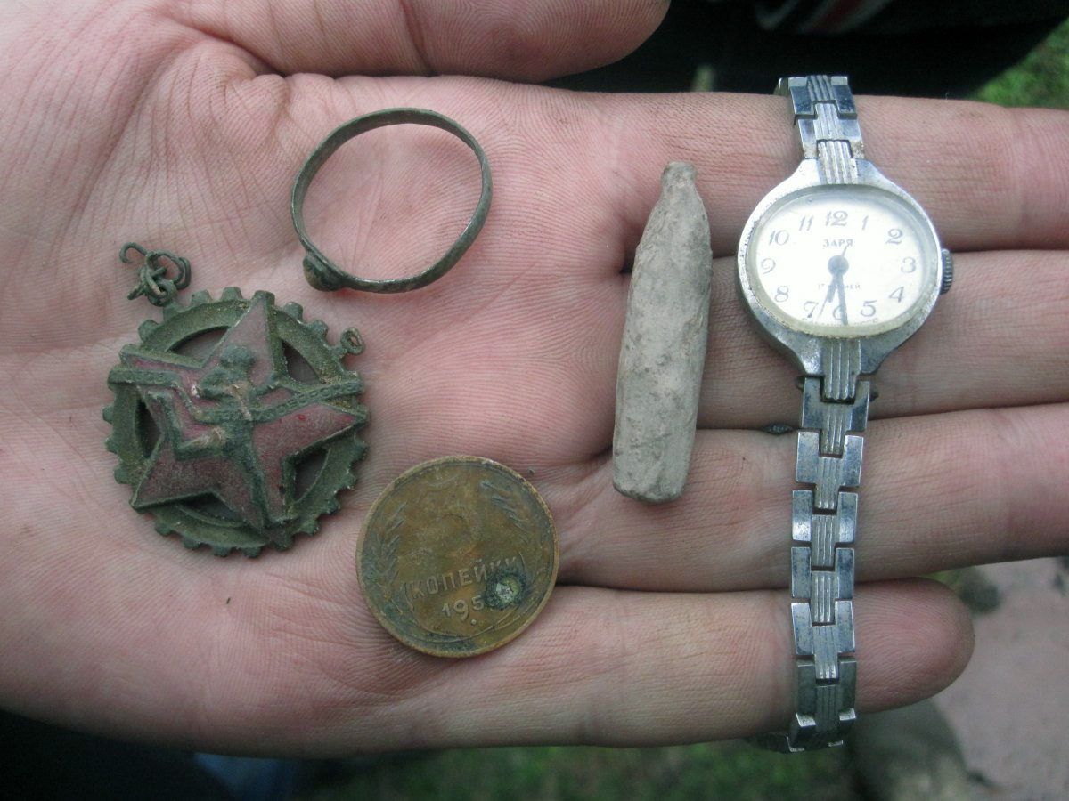 Через неделю на том месте были обнаружено еще несколько свинцрвых печатей, серебрянное кольцо (по словам нашедшего), монеты царской эпохи и СССР, кокарда и часы СССР.