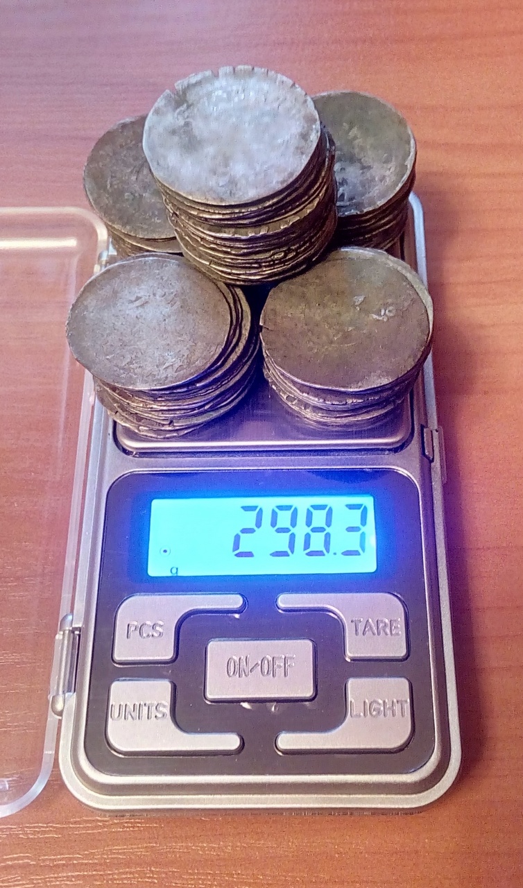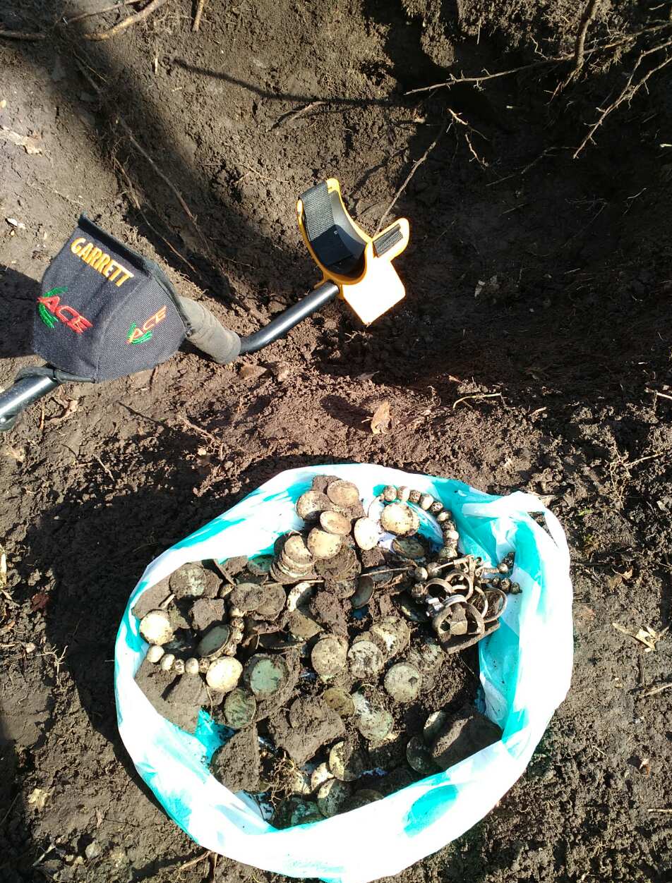 Найдено мной в лесу неподалеку старой дороги, на глубине примерно 20-30 см. Все вещи ничем не обрабатывались, только помытые водой от земли. Горшок разломанный, все детали горшка что нашел добавляются.В кладе было: сережки 2 шт., колты 2шт., кольца 6шт., пражские деньги 111 шт. целых и 1 шт сломана на продажу выставляю 109 шт. + 1 сломаную, 2 шт оставляю себе на память. Колты, серьги и некоторые кольца в позолоте. У кольца с камнем выпал камень, видно по фото. В одном из колтов 3 украшения имеют не значительные повреждения, 1 серьга также повреждена, фото повреждений прилагаю. Вес указан на фото. Материал: серебро, серебро с позолотой.