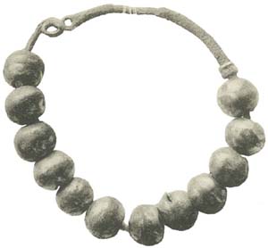 Среди памятников юго-западной части Новгородской земли хорошо известны своеобразные украшения, состоящие из проволочного кольца с нанизанными на него пустотелыми, составленными из двух половинок бусинами. Практически во всех случаях один из его концов завершает спиралевидный, завёрнутый внутрь кольца завиток, а второй – сквозное отверстие-ушко. Изучение морфологической эволюции таких колец и их корреляция с сопутствующим материалом позволила ряду исследователей доказательно соотнести их с древностями водских племён [Седов В.В. 1953, с. 194; 1987, с. 37; Лесман Ю.М. 1982, с. 65-74].