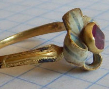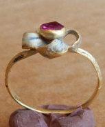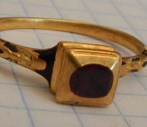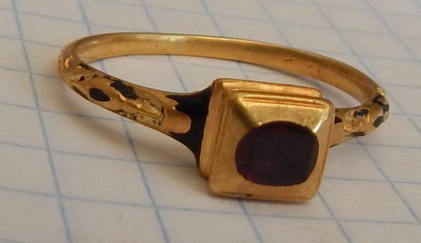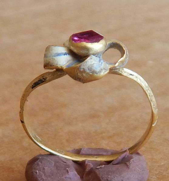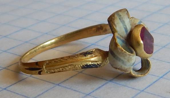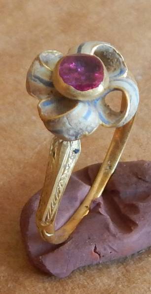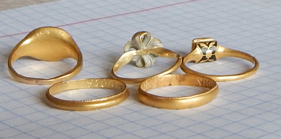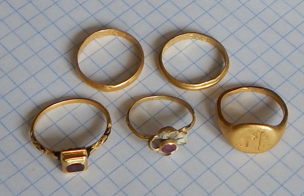 Звездчатые зернистые колты известны по территории Польши и Руси, датируются 12-13 веками, смотрите польский каталог Skarby wieków średnich io.ua/8352204. Остальные предметы явно позднего средневековья, и вполне вероятно, ровестники дукатов. Данный клад еще раз подтверждает, что ювелирные изделия могут служить очень долго. Скорее всего. это клад вора, который спрятал свою добычу, но за ней не вернулся. Камни на кольцах возможно рубин или розовый топаз.