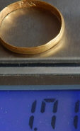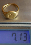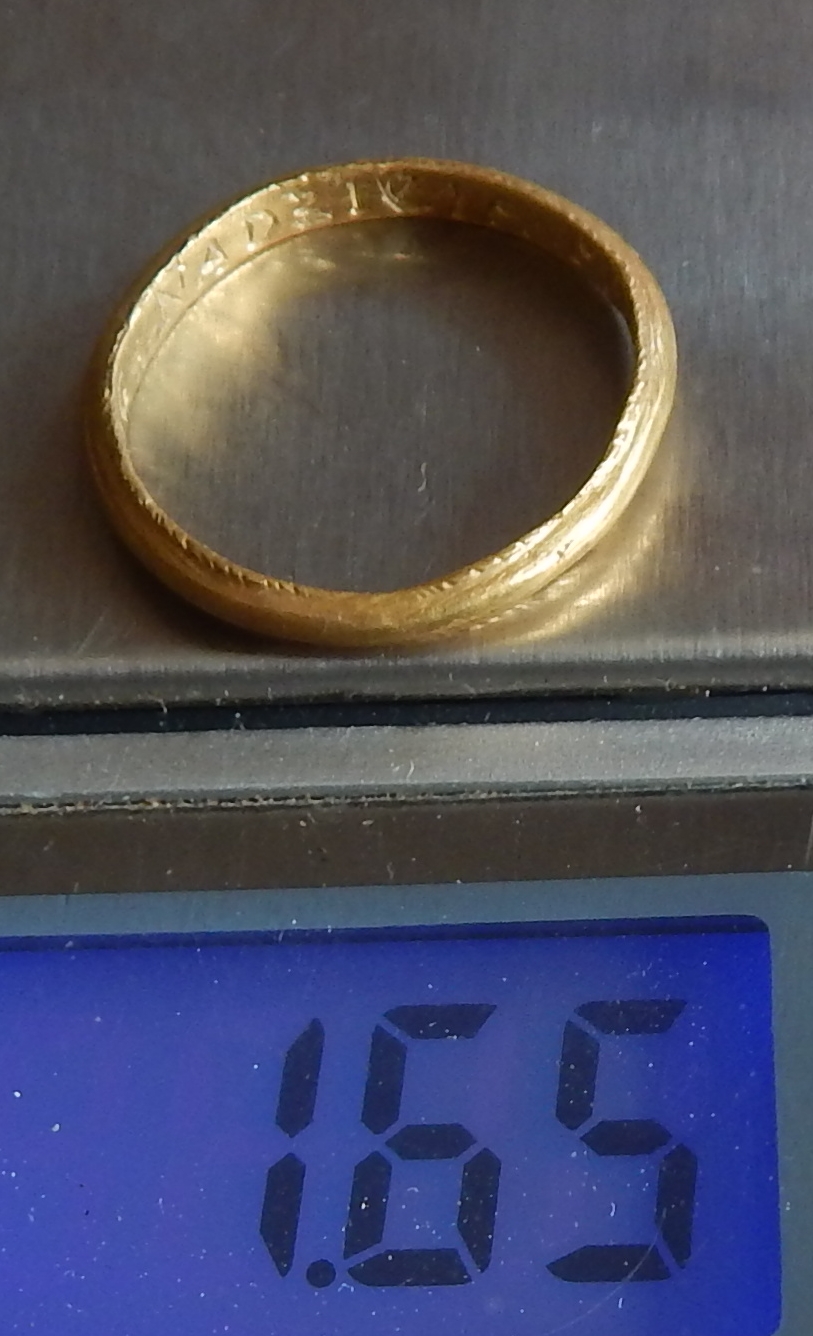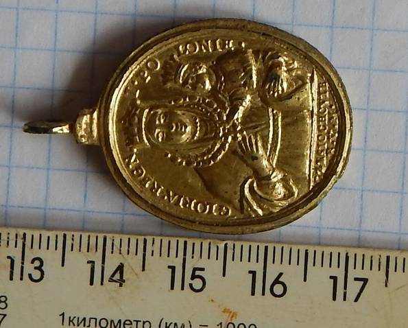 Материал: золото, проба выше 750-той. Надпись может означать: «только на бога надеюсь»