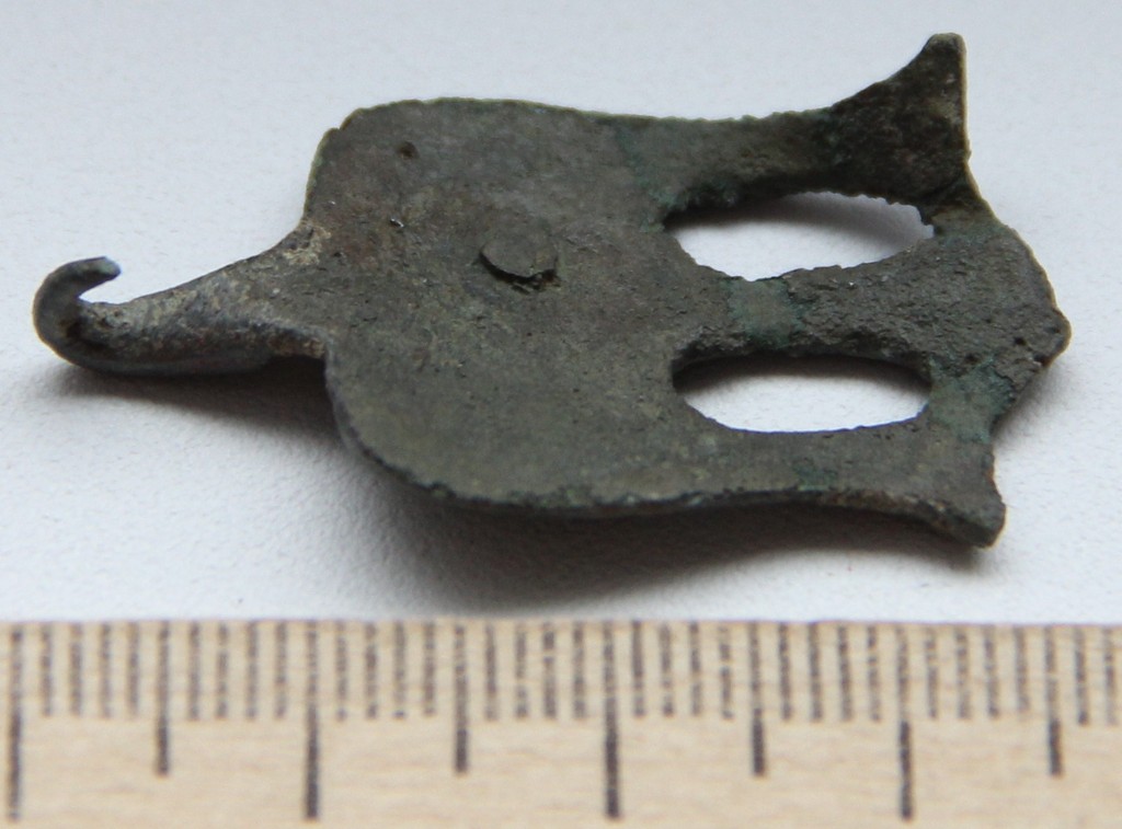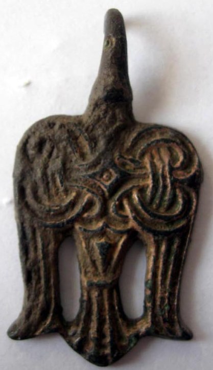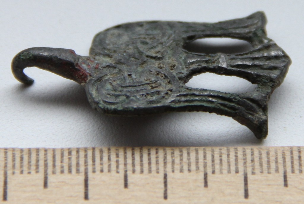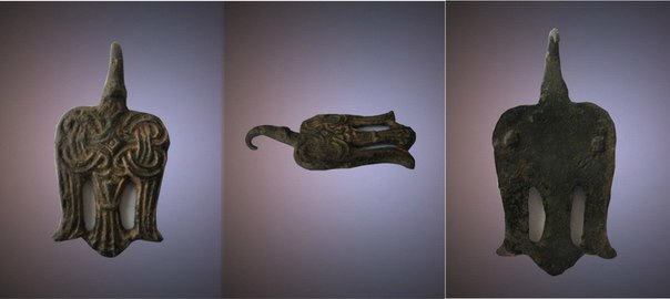 Данный крюк очень похож на недавнюю находку на Старой Ладоге часть формы для отливки, как указали журналисты – «печати Рюрика». Несмотря на то что датировка его 930 год и отливали из неё не печати, а принадлежности мужского костюма. Конкретно крючок для фиксации обмоток голени. Перемычки соединяющие хвост и крылья нужны для фиксации обмоточной ленты.