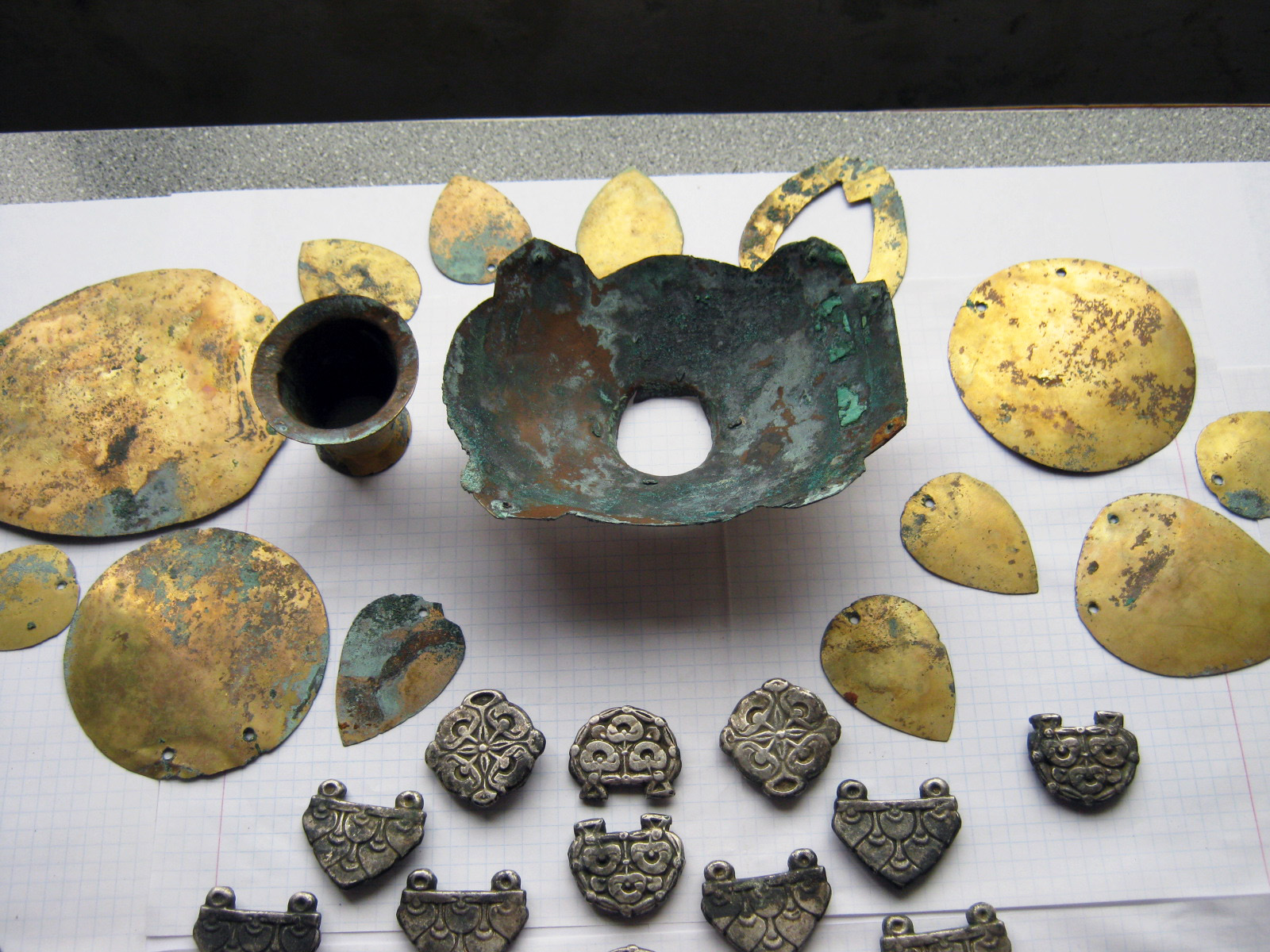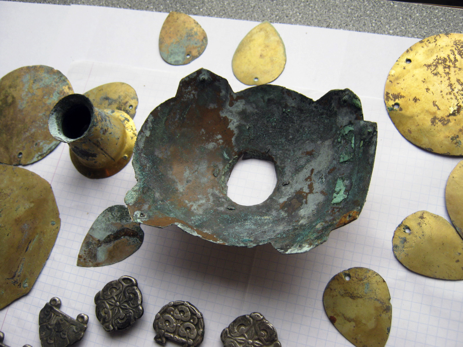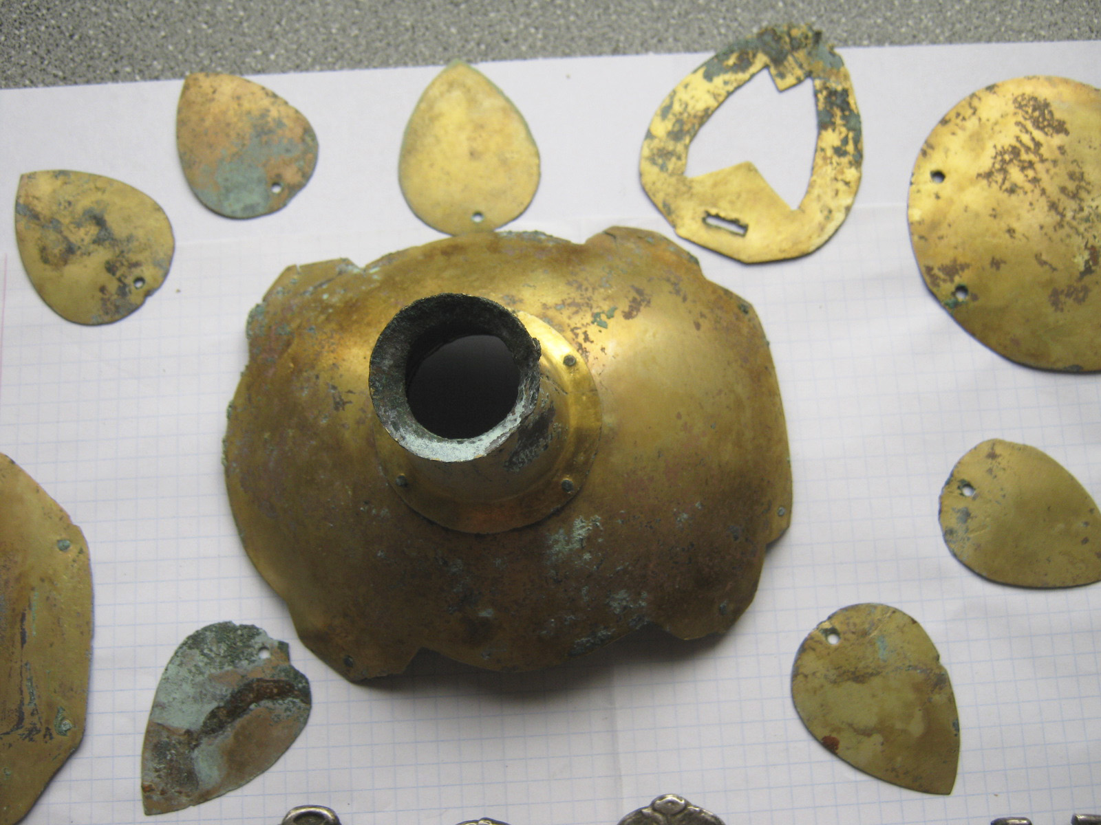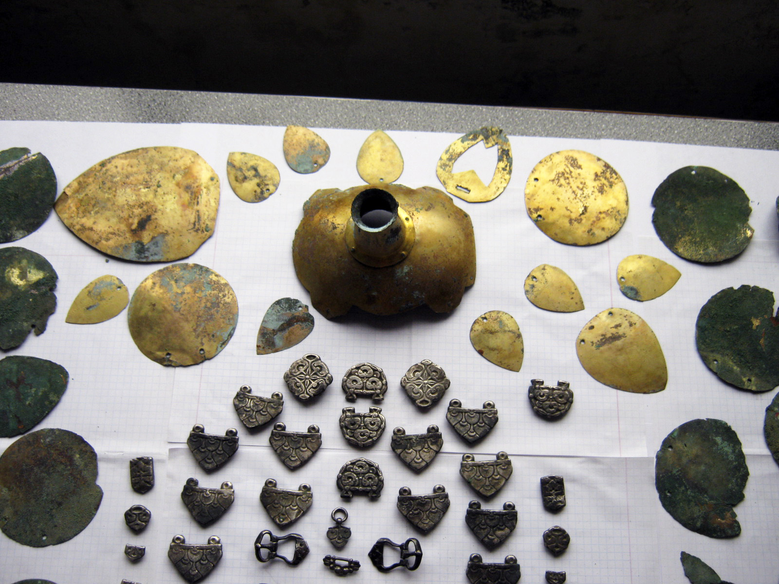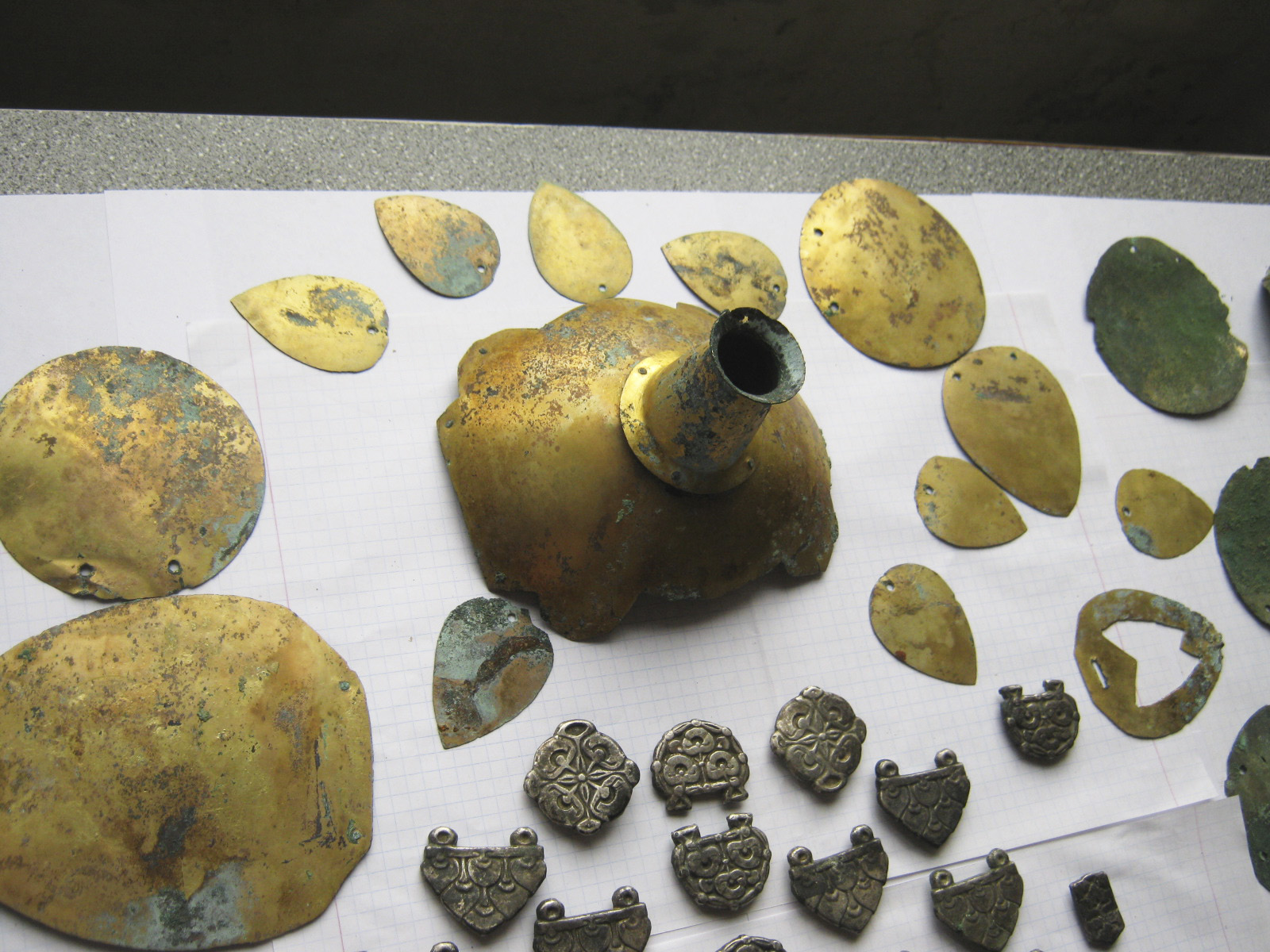 Позолоченный предмет с трубкой является оголовьем коня, часто используется термин «конский начельник». Пряжки, вероятнее всего – сбруйные. Позолоченные листообразные и дискообразные предметы, так называемые «фаллары» – являются деталями украшения коня, и бубенцы тоже скорее всего от него.