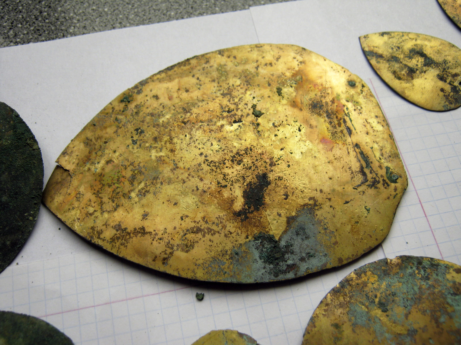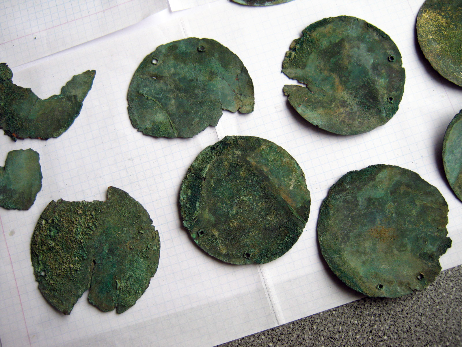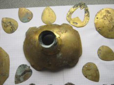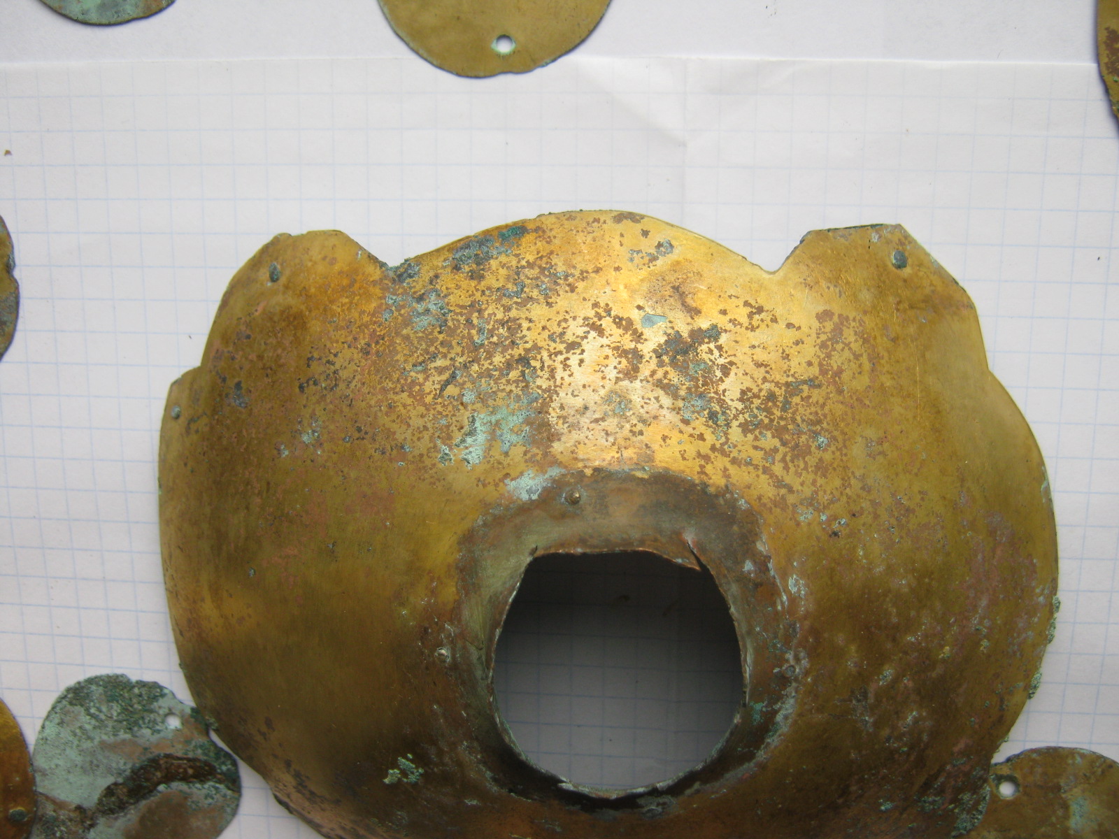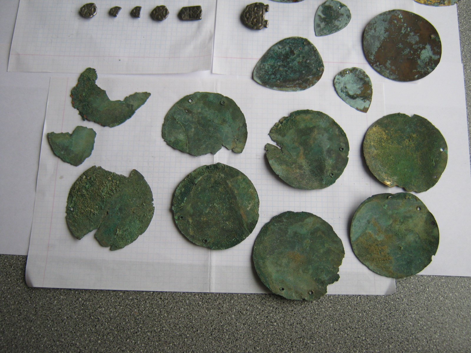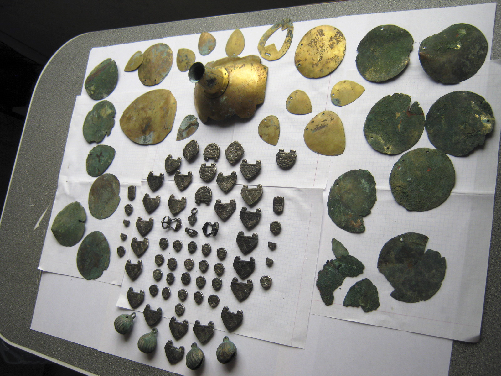 Позолоченный предмет с трубкой является оголовьем коня, часто используется термин «конский начельник». Пряжки, вероятнее всего – сбруйные. Позолоченные листообразные и дискообразные предметы, так называемые «фаллары» – являются деталями украшения коня, и бубенцы тоже скорее всего от него.