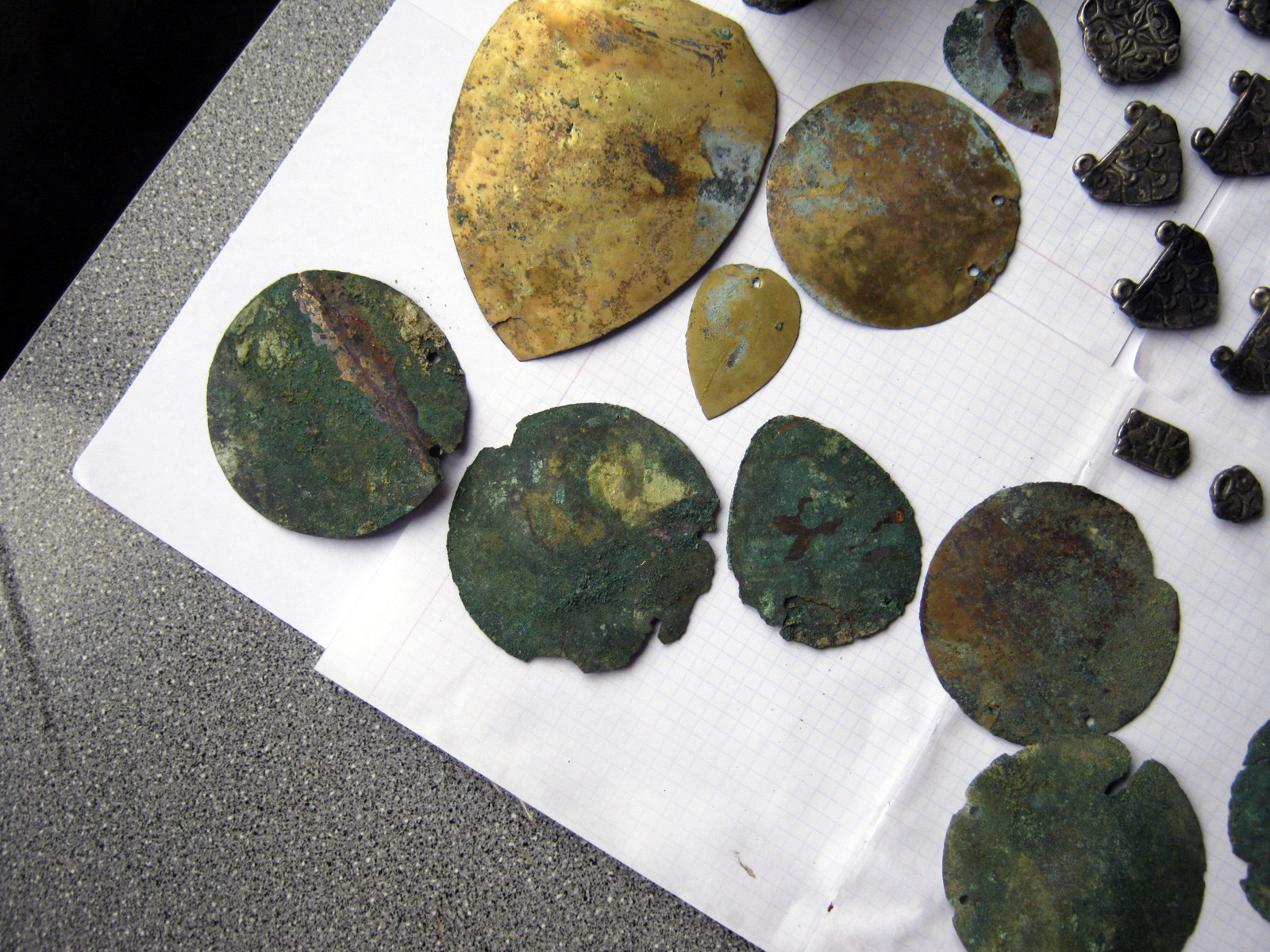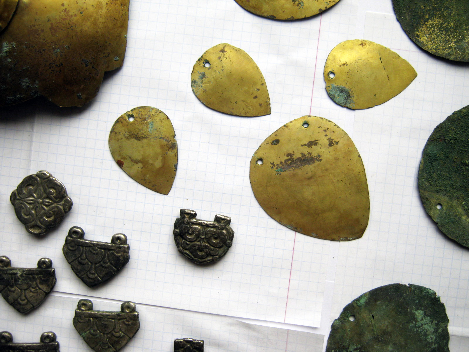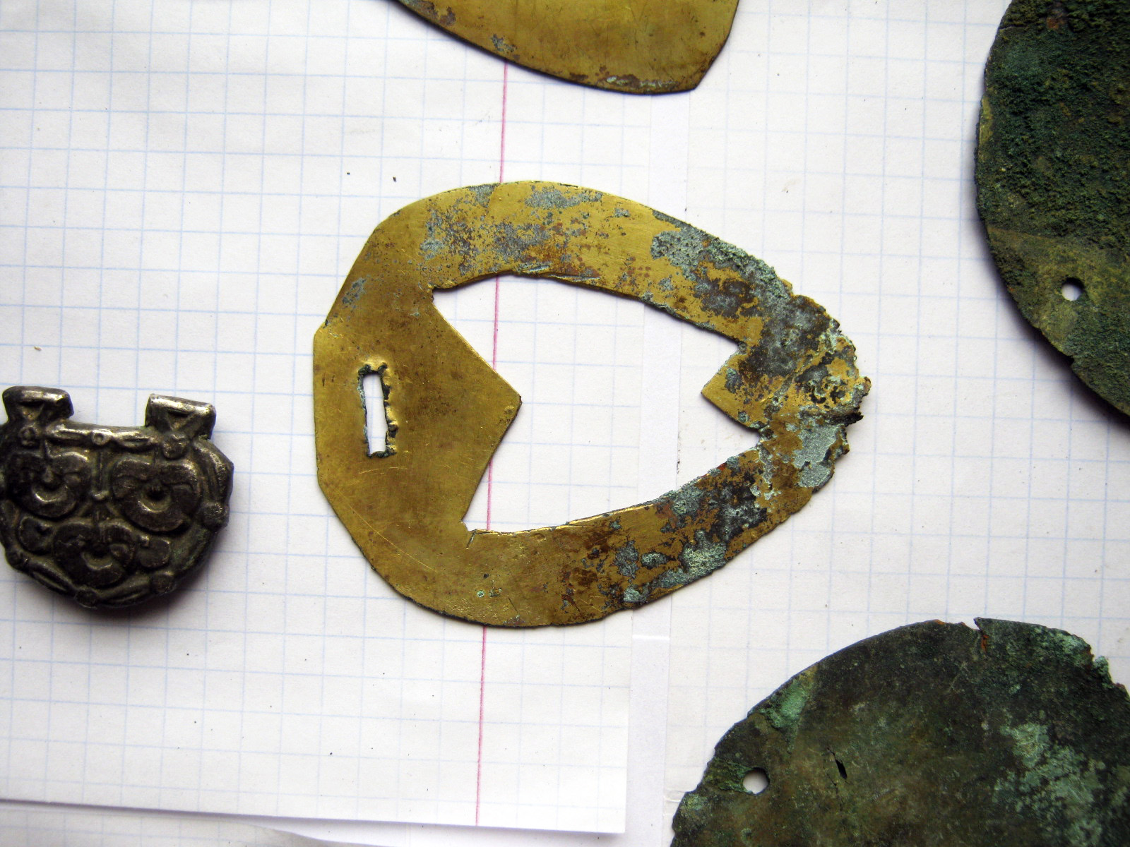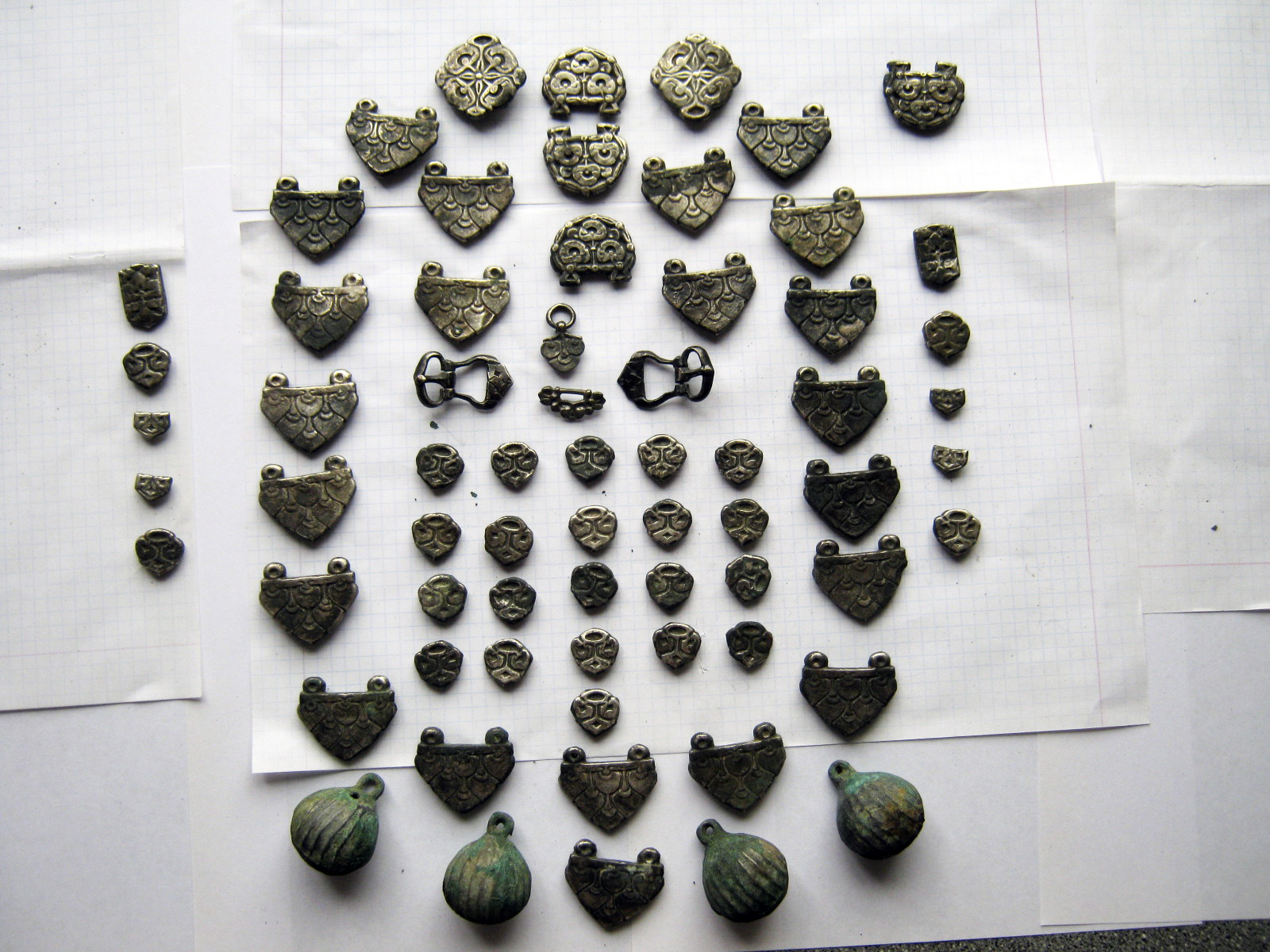 Крупные и мелкие серебряные накладки здесь – украшения пояса. Бляшка со сквозным прямоугольным отверстием и бляшка с подвижным ушком (так называемый «чумбурный блок»), могут быть деталями как поясного набора всадника так и снаряжения коня.