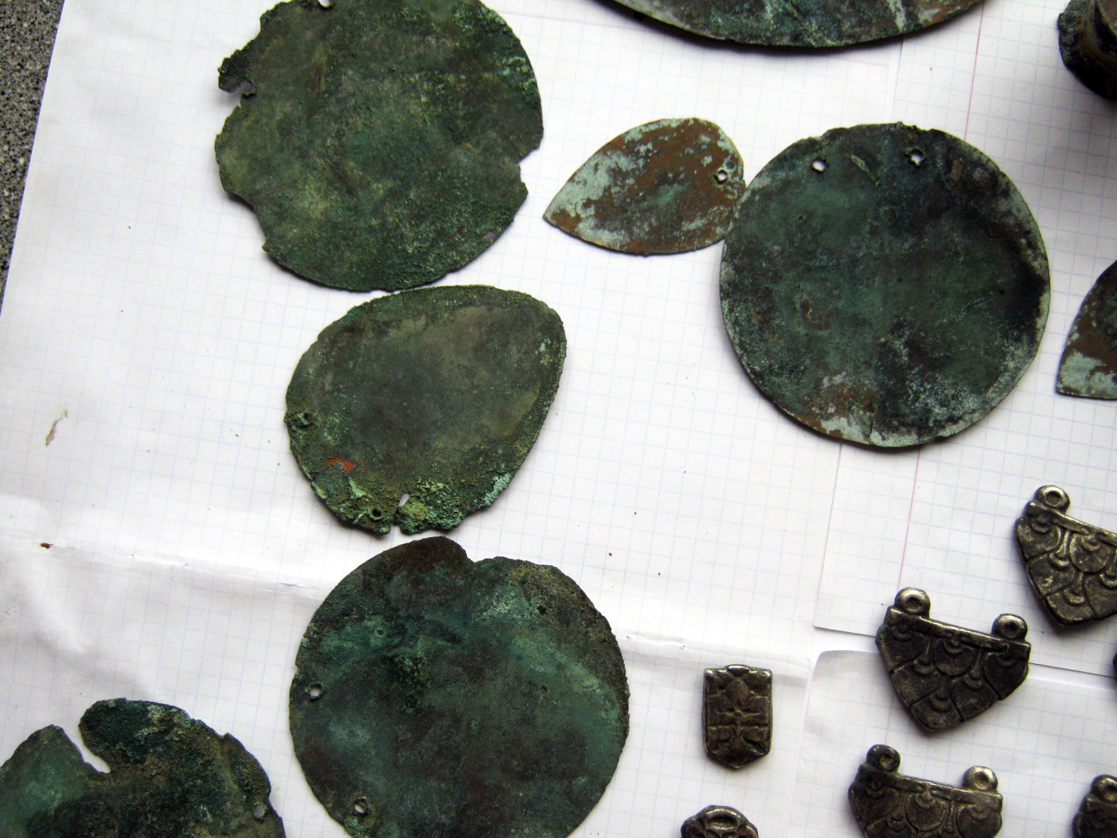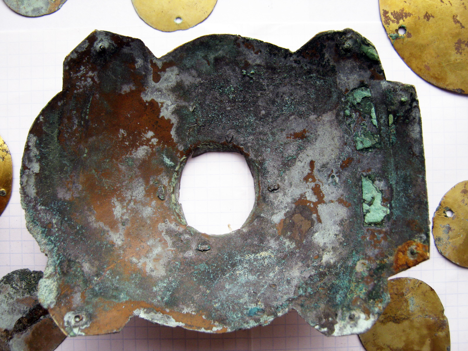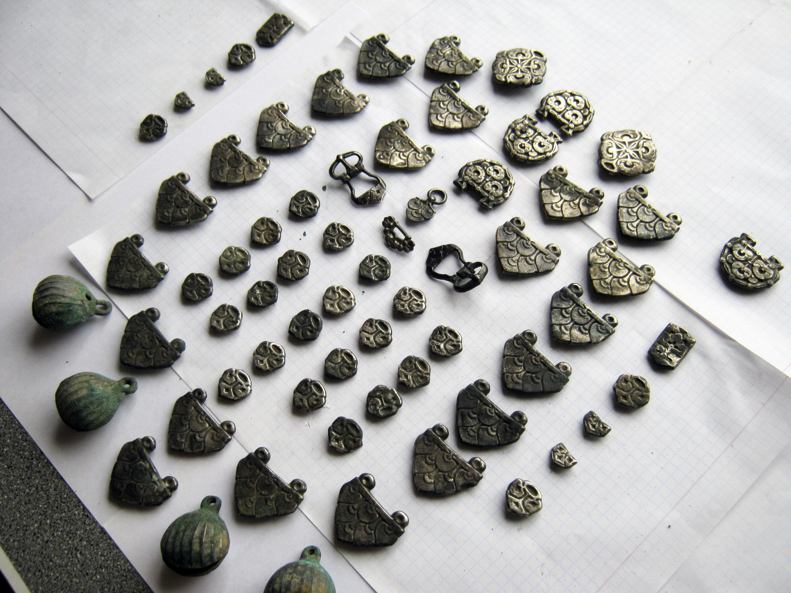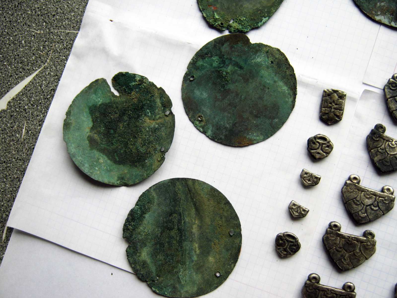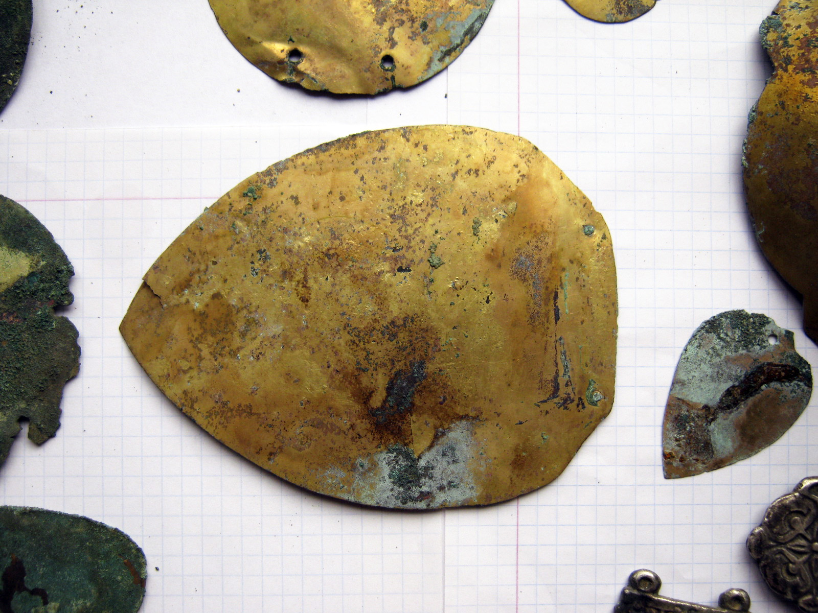 Крупные и мелкие серебряные накладки здесь – украшения пояса. Бляшка со сквозным прямоугольным отверстием и бляшка с подвижным ушком (так называемый «чумбурный блок»), могут быть деталями как поясного набора всадника так и снаряжения коня.