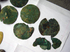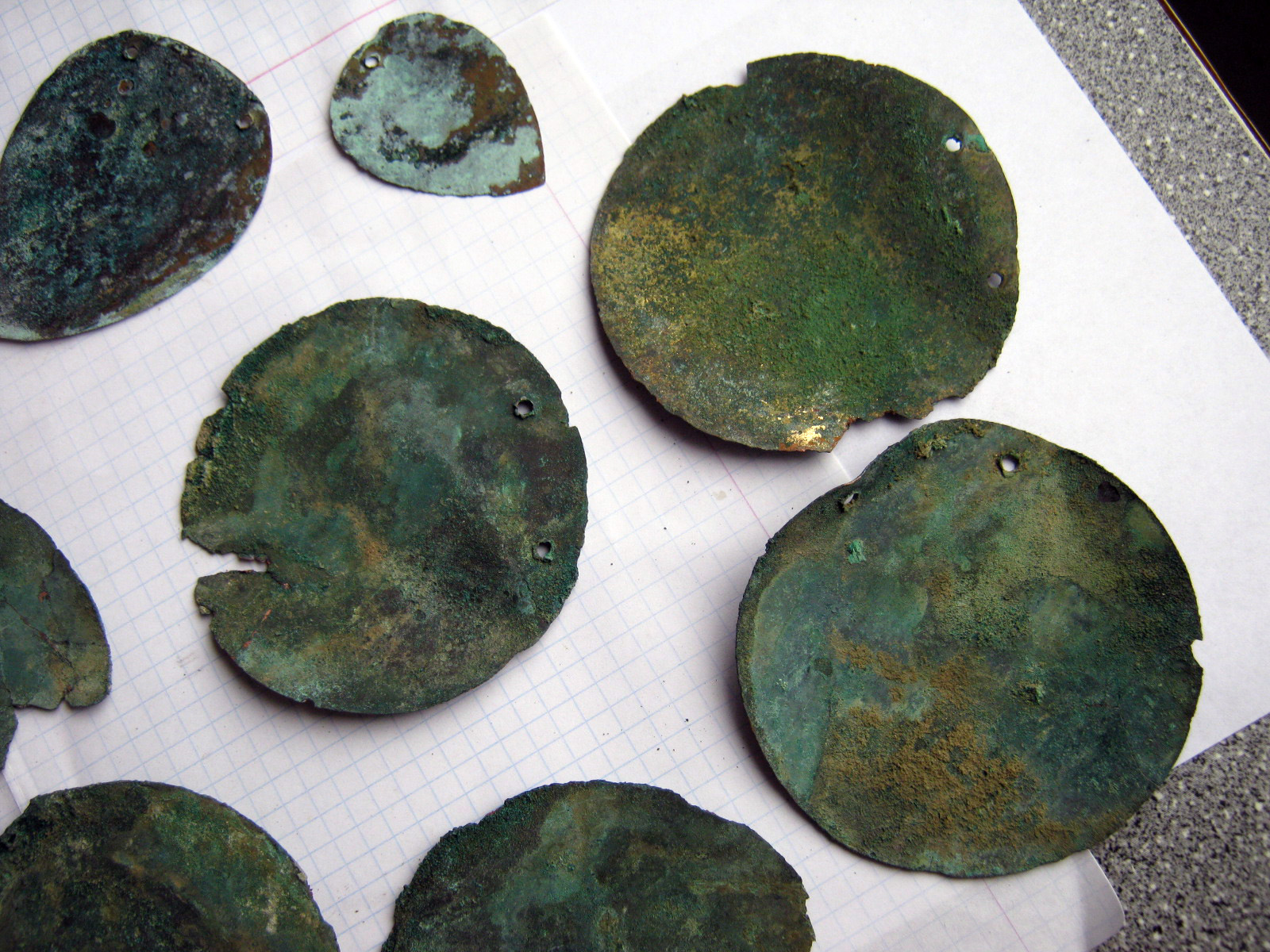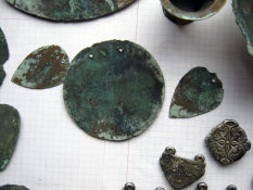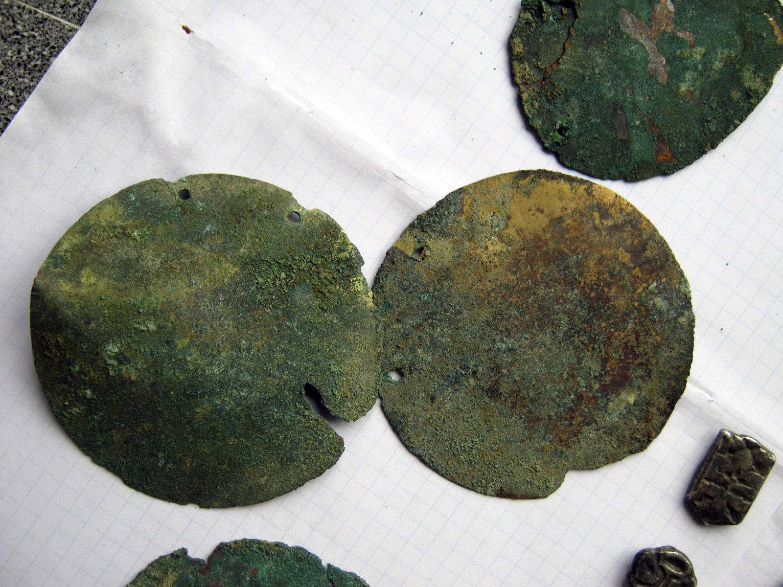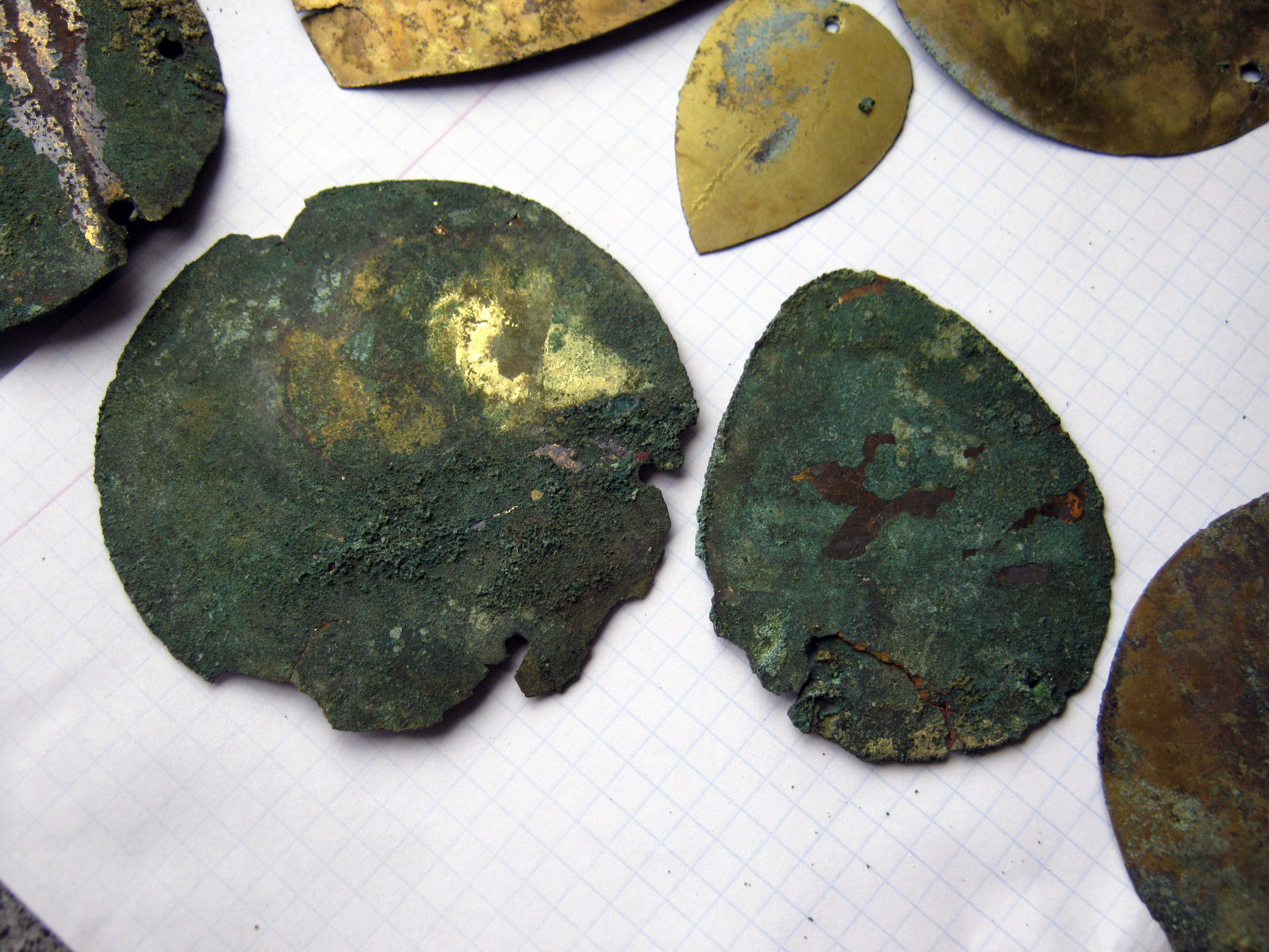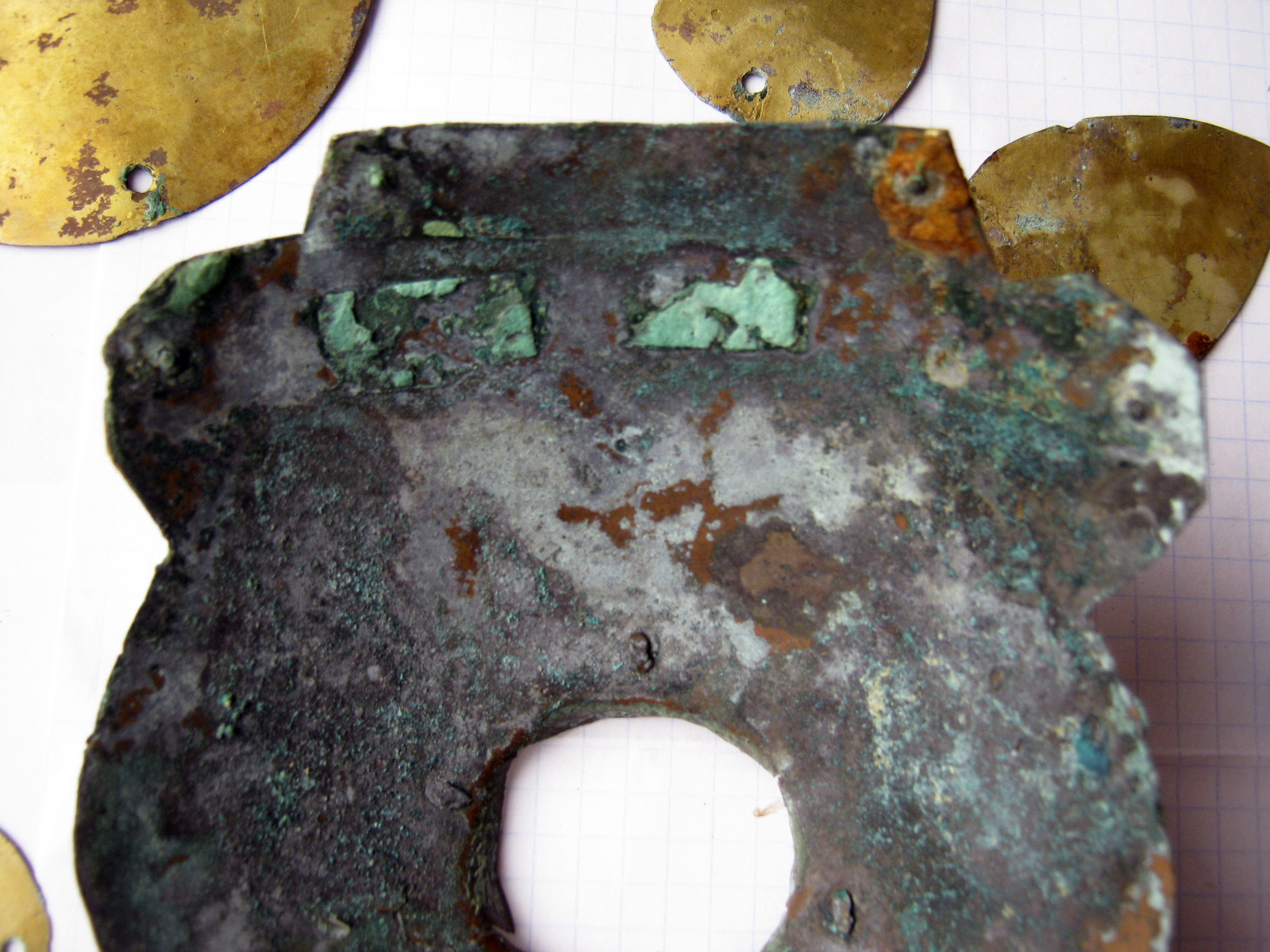 Крупные и мелкие серебряные накладки здесь – украшения пояса. Бляшка со сквозным прямоугольным отверстием и бляшка с подвижным ушком (так называемый «чумбурный блок»), могут быть деталями как поясного набора всадника так и снаряжения коня.