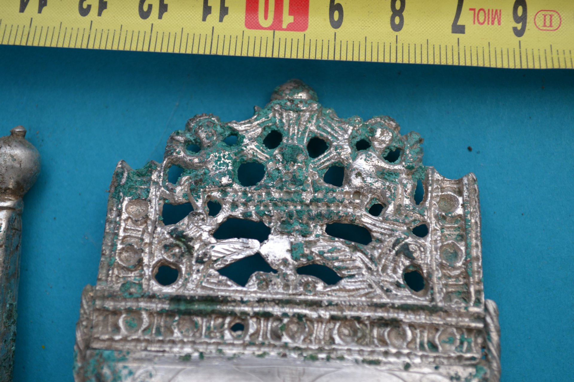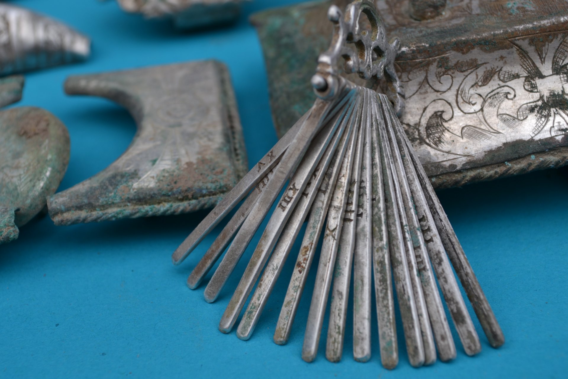 Подскажите, кто что знает и если возможно по цене? С ув. 888. в сопутке были полтораки, орты и талера. Серебряный клад Шляхтича 1 кг. 290 грамм – так на Виолити было обозначено начало очень интересной темы по находкам подобных детелей поясов, известных под обозначением «Пшерворский». Нет, они не относятся к древней Пшервоской культуре, просто считется что изготовляли их в городе Пшерворск, который на территори современной Польши. Было это 31.07.2016. Остановимся на них подробнее. Цитата: предок Эпоха Руины 1657-1687 годов. Клад спрятан в эпоху Руины, сами предметы сделаны до 1657 года, до Руины. Хотя, клад мог быть спрятан и в период 1649-1654 годов во время войн Хмельницкого. Цитата: Walera Клад вещей шляхтича, период середина-вторая полвина XVII Люди прятали все ценное. В кладе у вас элементы поясного набора. элементы от ножен (видится корабелла) сабли, накладка на ее гарду, элементы сабельного подвеса, элементы одежной фурнитуры (пуговицы. пряжки и пр.). два католических креста на цепях. характерных тому времени. Женские украшения (кольца, серьги) Ну и т.д. В итоге - мечта любого колекционера Украины. Горшек не выбрасывайте. Это тоже удорожает вашу находку. Удачного решения! Цитата: Григорий А что за штука с римскими циврами на серебряных палочках? Кто-то видел подобное, как ее использовали? Цитата: bookanir Обратите внимание на форму нижней части палочек. Ответ о предназначении предмета именно в ней. Это инструмент пробировщика. На черном камне рисовалась полоска металлом неизвестной пробы, а рядом полоска палочкой известной пробы (в то время проба измерялась в лотах, от 1 до 16), когда цвет нарисованных полосок совпадал, определялась проба металла искомого предмета.