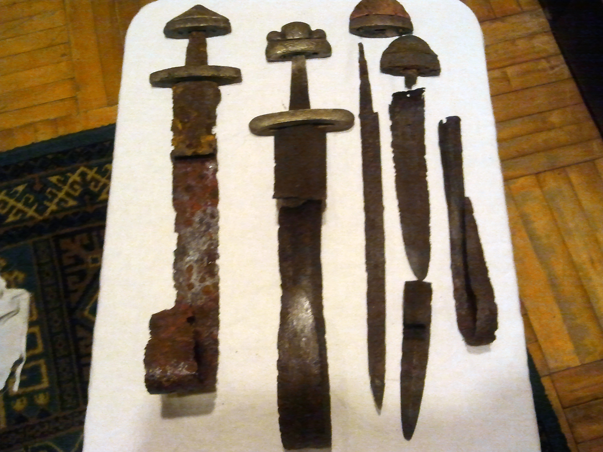 Фотографии находок ритуально сломанных мечей (4 навершия), наконечников копий (5 штук, одно ритуально сломано). Еще скрамасаксы (3, возможно 4 так как есть нечто совершенно скомканное), гривны, топоры, ножи, фибулы (3 шт), наконечники сулицы, гарпун, поясные накладки, и прочая металопластика были присланы мне по E-mail для определения в 2012 и 2013 году. Данные находки датируются X -началом XI века. Далее прямой текст искателя будет выделен как цитата. Методические материалы для определения размещены на второй странице.