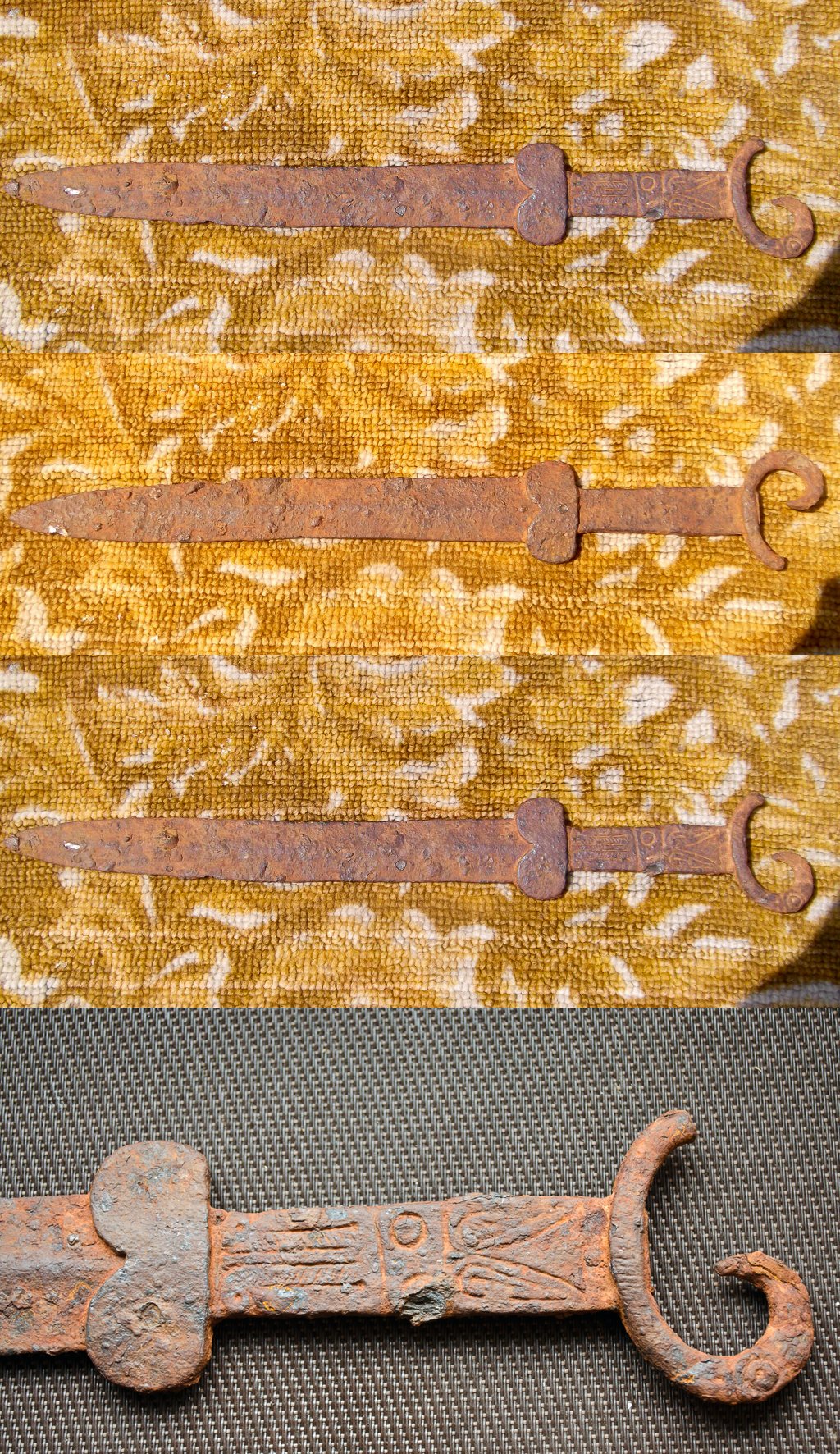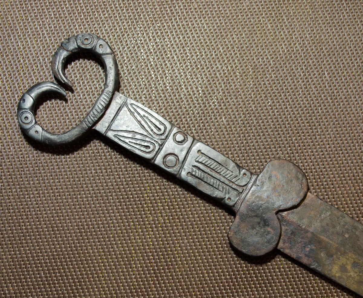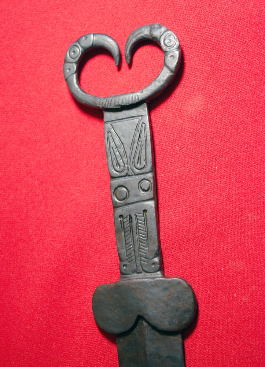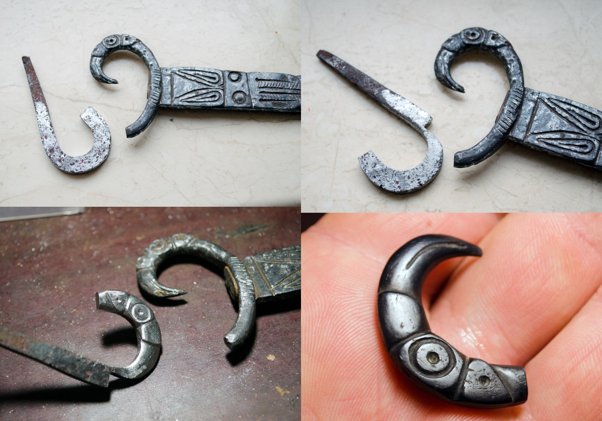 28 янв. 2015 реставратор valja на форуме Виолити показал как реставрировал очень интересный экземпляр акинака с навершием в виде голов грифов, украшеной орнаментом в зверином стиле рукоятью и с клином с изгибом. На первом фото показано то в каком виде он попал в руки реставратора. После расчитстки рукояти стали хорошо видны узоры в зверином стиле на рукояти.