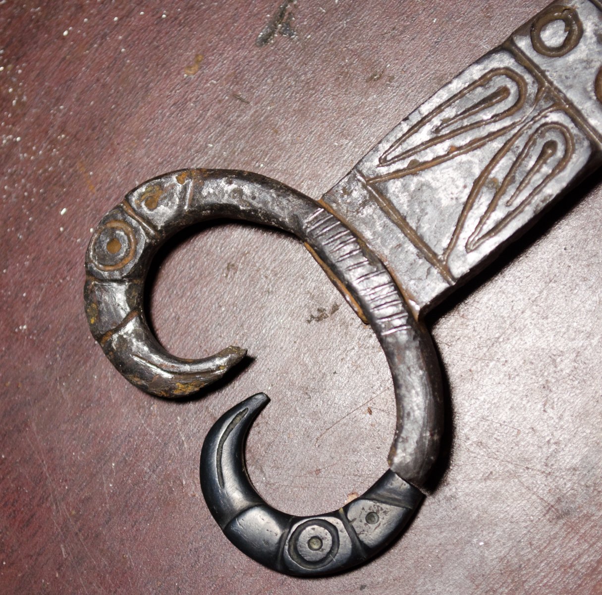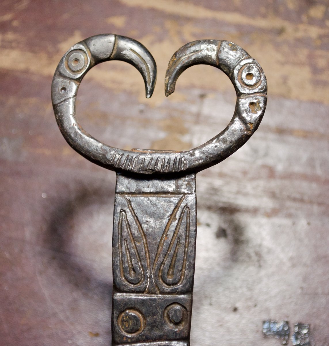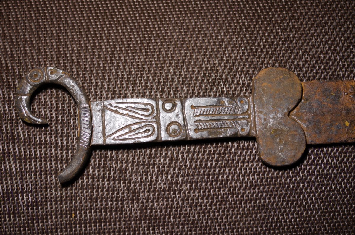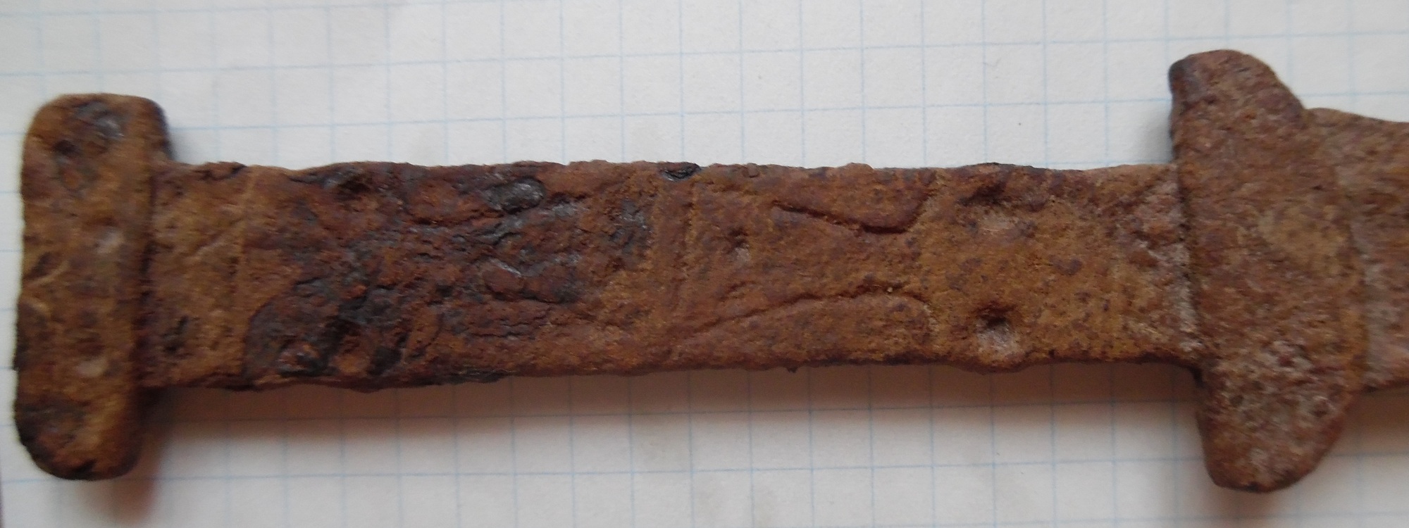 28 янв. 2015 реставратор valja на форуме Виолити показал как реставрировал очень интересный экземпляр акинака с навершием в виде голов грифов, украшеной орнаментом в зверином стиле рукоятью и с клином с изгибом. На первом фото показано то в каком виде он попал в руки реставратора. После расчитстки рукояти стали хорошо видны узоры в зверином стиле на рукояти.