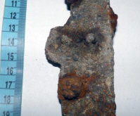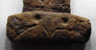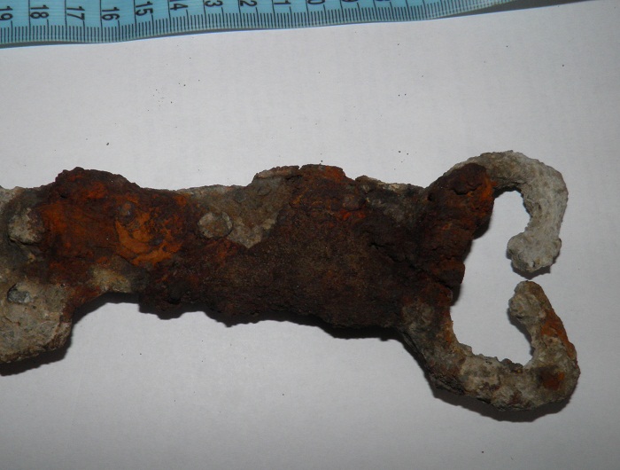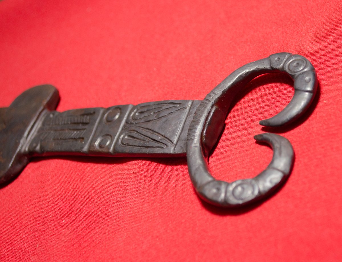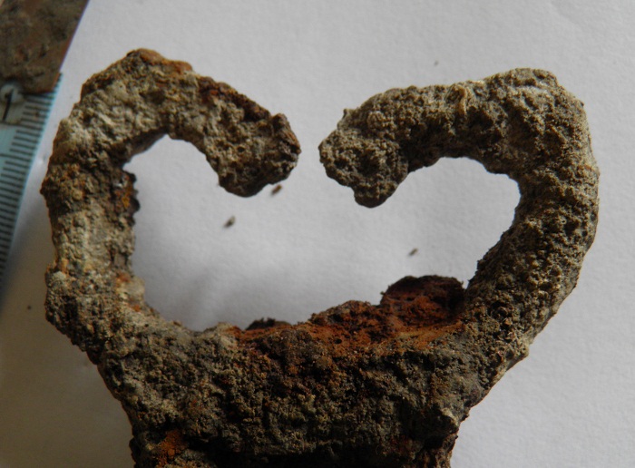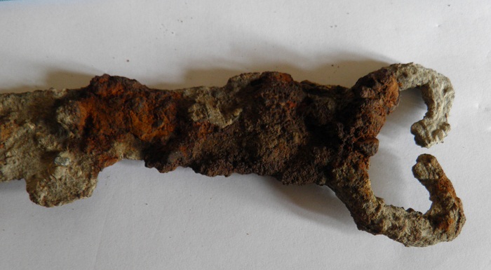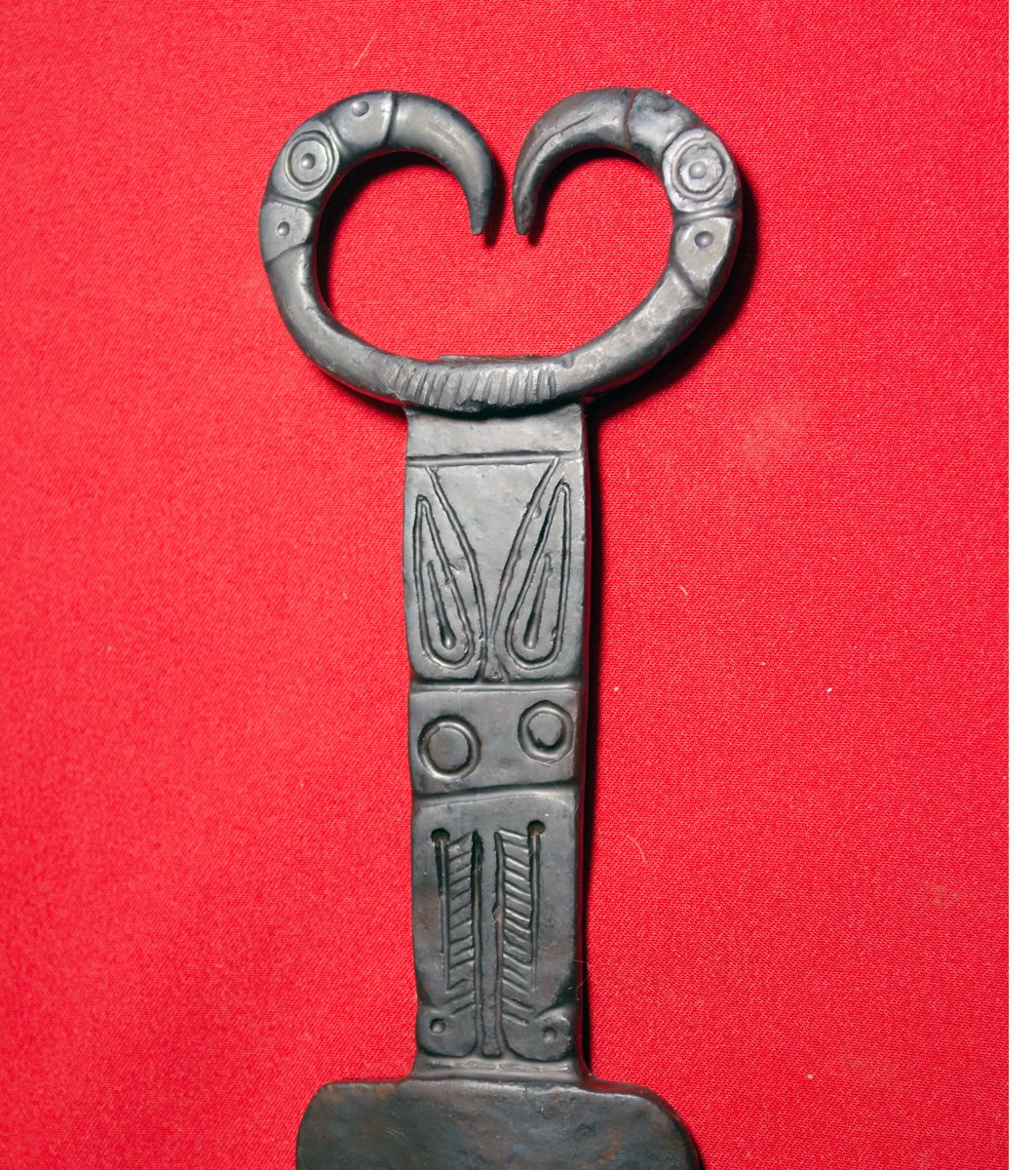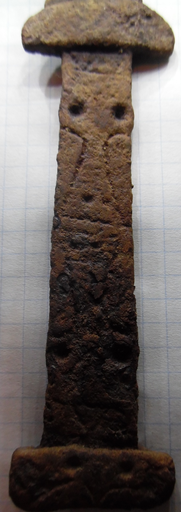 28 янв. 2015 реставратор valja на форуме Виолити показал как реставрировал очень интересный экземпляр акинака с навершием в виде голов грифов, украшеной орнаментом в зверином стиле рукоятью и с клином с изгибом. На первом фото показано то в каком виде он попал в руки реставратора. После расчитстки рукояти стали хорошо видны узоры в зверином стиле на рукояти.