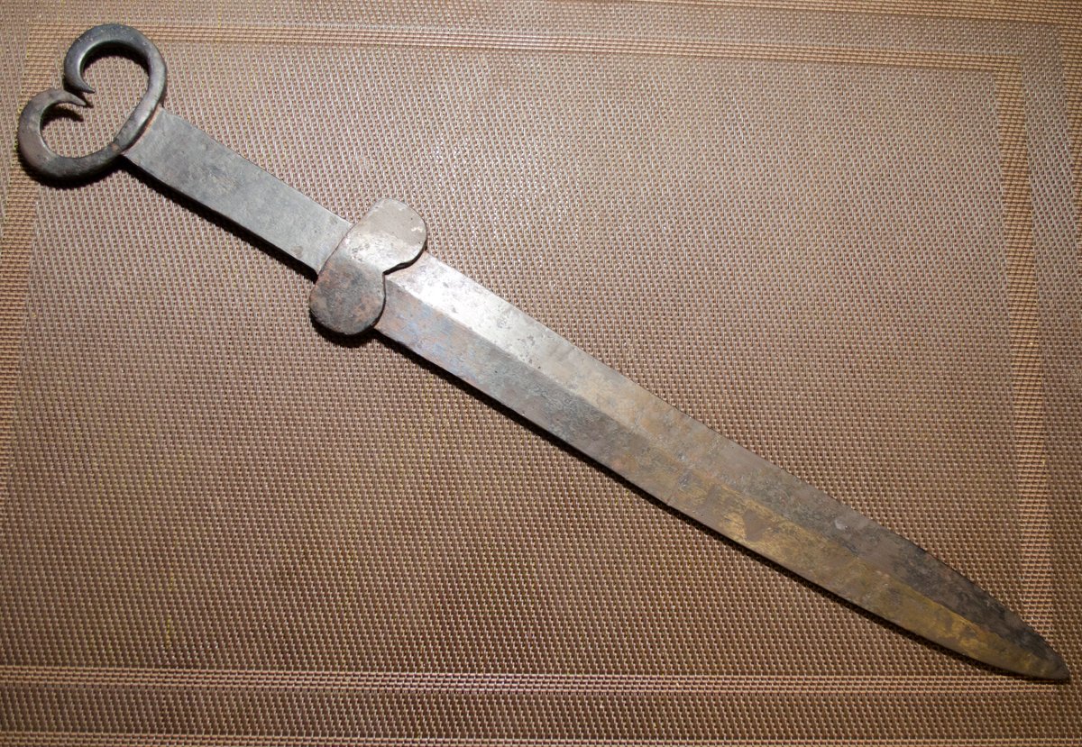 10 апреля 2017 , искателем hammer1103, был показан скифский однолезвийный кинжал ятаганоподобной заточки. Его полная длина 515 мм, так что он можно сказать короткий меч.