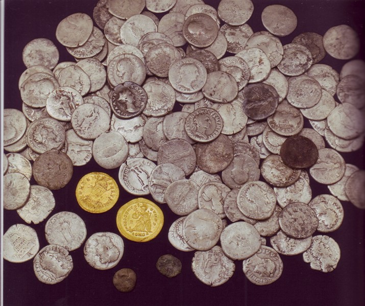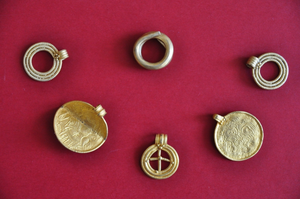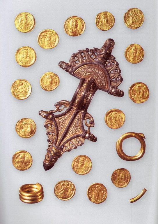 Несколько находок изделий из золота были обнаружены на соседних к S.M. хуторах-поселениях (рис. 8), часто в остатках жилищ. Из двух кладов, найденных в одном таком поселении (Dalshøj) было по меньшей мере 17 солидов, другой клад оттуда: серебряная позолоченная фибула и золотые слитки (рис . 12). Возможно, самый замечательный клад, помещенный внутри помятого серебряного римского сосуда – это клад из Fuglesangsager (рис. 13), содержал скандинавские брактеаты, солиды, элементы бус и колец, подвески, аналогии которых находили в Suchań в Передней Померании.