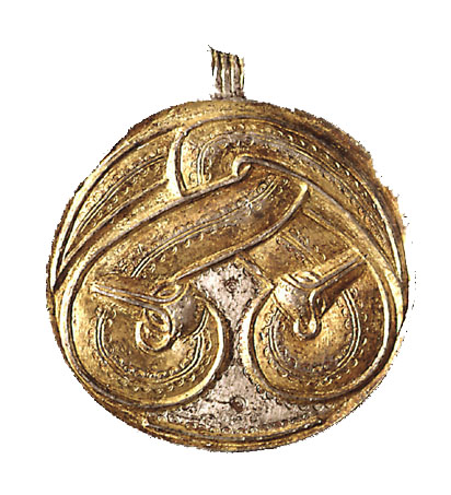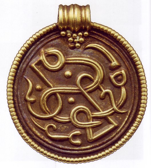 Скандинавский брактеат (Scandinavian bracteate от латинского bractea – тонкий кусок металла), другие названия: Нордик б., Германский б. – круглый, односторонне украшенный золотой кулон периода Великого Переселения Народов с центральным декоративным рисунком. Выглядит как металлический лист, где на лицевой стороне, металлической матрицей, выбит определенный сюжет. С.Б. снабжены петелькой для подвешивания, и как правило, декоративным ободком по краям в виде завитков проволоки.