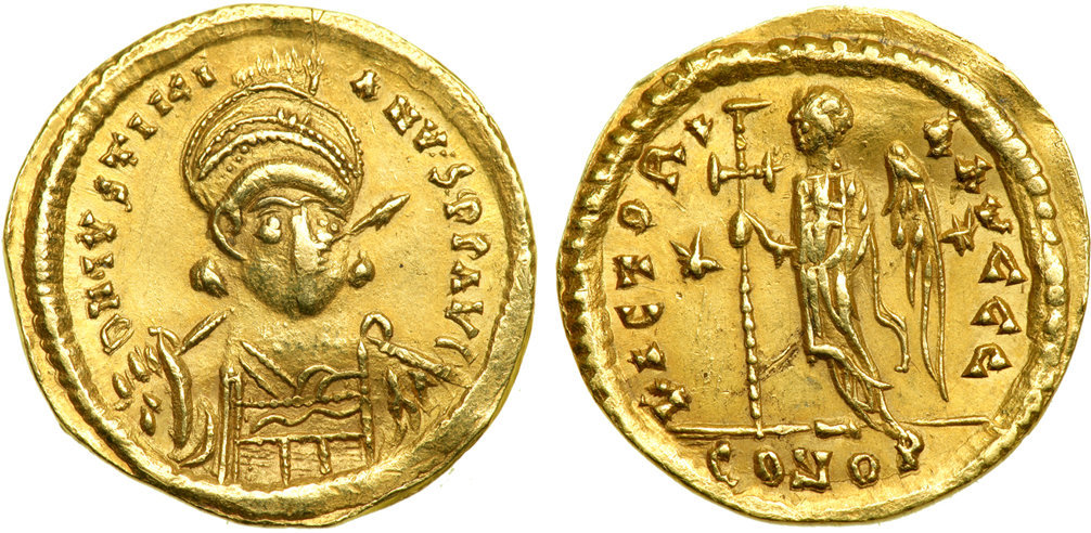 Солиды просуществовали в изменяемом виде (постепенно превращаясь в английский фунт стерлингов) до 11-го века. После падения Западной Римской империи, солиды продолжали выпускаться в Византии (рис. 22), где они стали основным драгоценным металлом после деноминации. Солиду соответвовало 24 серебряных силиквы (siliquae). От правления Юстиниана I до Констанса IV чеканился так называемый "легкий солидус", с весом 4,48 г, что соответствует 20-23 силиквы. С 8-го века и далее в солид был известен как nomisma (греч. nomizein – доверенный, надежность).