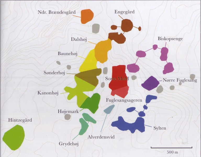 Лишь очень небольшая площадь Sorte Muld был исследована при помощи традиционных археологических раскопок. Применялись и другие методы, которые включат в себя: взятие проб почвы на измерение уровня фосфатов, бурение, а также методы неразрушающего исследования, такие как геомагнитные съемки и аэрофотосъемки. Полученные результаты были использованы для создания карты площади Sorte Muld и его окрестностй. Городище, предположительно имело в своём центре большой зал – место местной властной элиты, а также святилище и мастерские ремесленников, особенно ювелиров. Вокруг площади были небольшие одиночные дворы-усадебки; весь комплекс занимает около 1 км2 и предположительно имел планирование, предполагающее бережное использование местности. Между развилкой и пристанью на Vigehavnen – на расстоянии 2 км, проходит дорога, известная как Krøblingevejen ("Извилистая дорога").