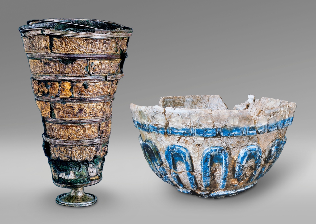 Самая сенсационная находка, сделанная на Уппокре – остатки ритуального здания, 13х6,5 м, с тремя входами. Судя по его уцелевшим необычным структурными элементам, это было высокое здание, возможно, подобное появившимся позже средневековым норвежским церквям. Его время использования датируется археологическими находками периода примерно с 3 по 9-й вв. Интерьер ритуального здания и площадь вокруг него дали замечательный набор находок, в первую очередь, артефакты обнаруженные в его центре, а именно: металлический кубок, украшенный серебром с золотой фольгой и фигурным орнаментом, 5-6-го столетия, и двухцветная стеклянная чаша, по-видимому изготовленная в Северном Причерноморье в 6-ом веке (рис. 4). Функция стакана и чаши предположительно была церемониальной. Рядом найдено более 130 гульдгуббаров (guldgubbar) – миниатюрных бляшек из золотой фольги с тисненными человеческими фигурками, возможно накладок-украшений на что-то. Среди находок фигурируют фрагменты стеклянного сосуда и железный дверной звонок. Большое количество мышиного помета, обнаруженного внутри здания позволяет предположить, что оно использовалось только в особых случаях, таких, как религиозные праздники или редко проводимые ритуалы. О таком рода деятельности свидетельствуют также обнаруженные вне ритуального здания сотни находок уничтоженного оружия – в основном наконечников копий, возможно трофеев, взятых от побежденных врагов, которые приносились в жертву. Рядом с ними был также большое количество костей, некоторые из них человеческие, что предположительно, свидетельствует о некоторых специальных церемониях.
