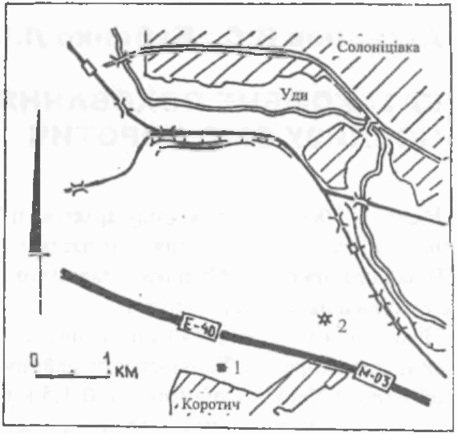Ситуаційний план поховання поблизу емт. Коротич: 1 катакомбне поховання; 2 курганний могильник скіфського часу.