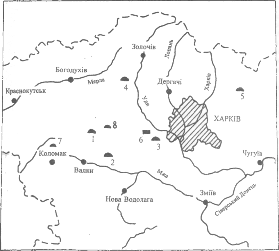 Карта розповсюдження катакомбних поховань скіфського часу у сівереькодонецькому регіоні: 1 Новий Мерчик; 2 Черемушна; 3 Пісочин; 4 Рідний Край; 5 Веселе; 6 Коротич; 7 Покровка; 8 Старий Мерчик