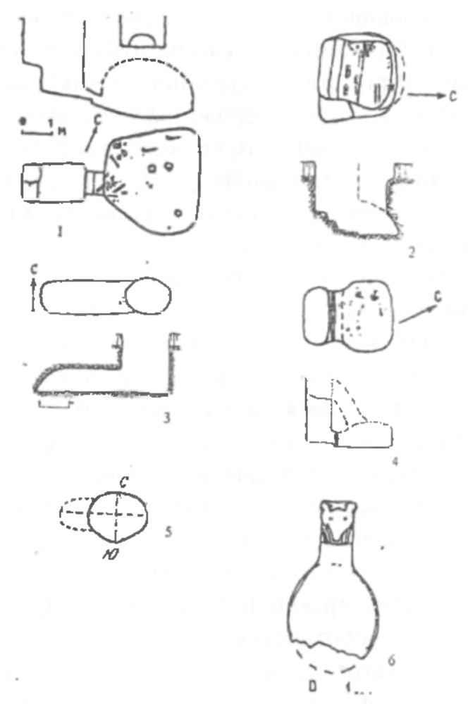 Плани та розрізи катакомбних поховань скіфського часу у сіверськодонецькому регіоні: 1 Веселе (Шрамко, 1992); 2 Рідний Край (Бандуровекий, Буйнов, 2000); 3 Пісочин (Бабенко. 2005); 4 Новий Мерчик (Шрамко, Бойко, 1988); 5 Черемушна (Либеров, 1962); 6 Ложечка. Селище поблизу м. Люботин. Випадкова знахідка. Матеріал: кістка.