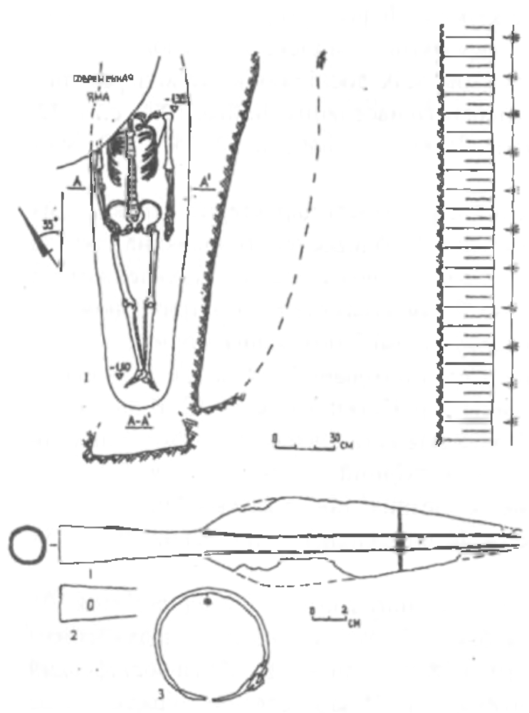 План поховання та інвентар: 1 план та розріз поховання; 2 наконечник списа; 3 браслет. Матеріал: 2, 3 залізо.