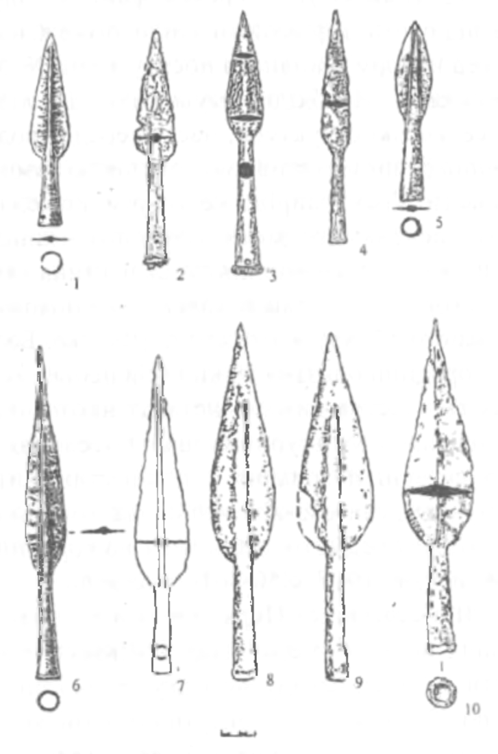 Залізні наконечники списів з поховань скіфського часу: 1 Сухин, випадкова знахідка (Галанина, 1977); 2 Яснозор’є (Ковпаненко, Бессонова, Скорый, 1994); 3 Тернове (Савченко, 2004); 4 Стеблів (Скорый, 1997); 5,6 Макіївка (Галанина, 1977); 7 Пісочин (Бабенко, 2005); 8,9 Новоселка (Бессонова, 1994); 10 Красний Поділ (Полин, 1984).