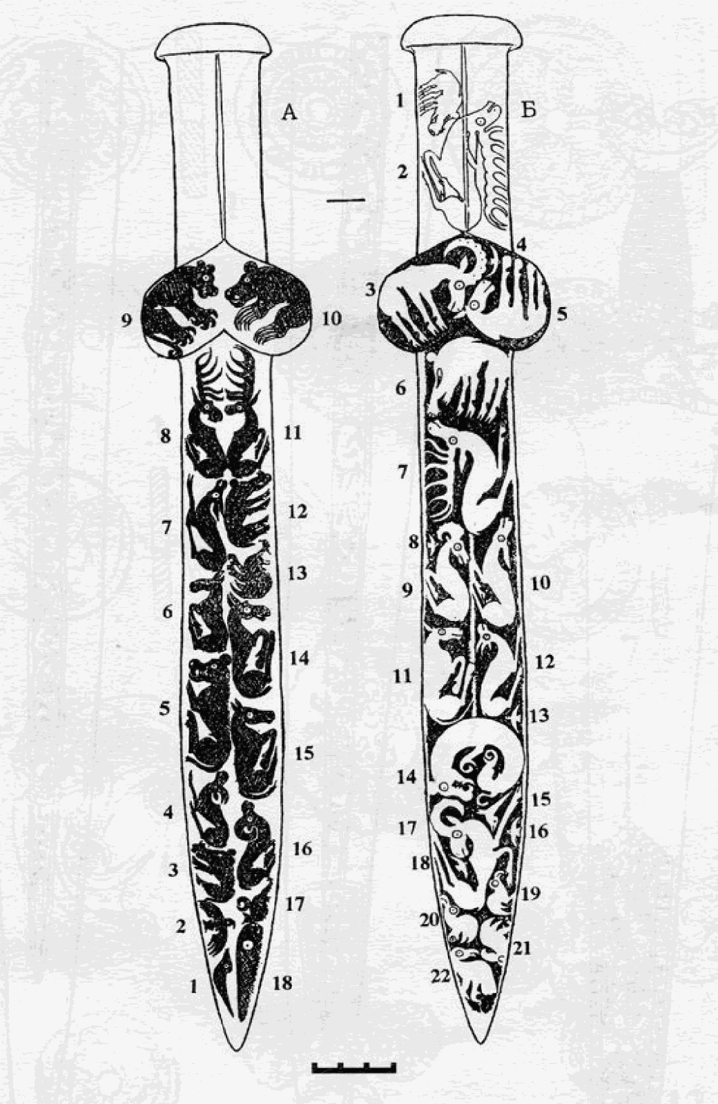 На кинжале нанесены изображения копытных (олень или лось, кабан, кулан, горный баран/козел), хищных животных (кошачий в двух вариантах, медведь), птицы (ласточка, козодой ?), хищных птиц (орел, сокол) и рыбы (сом/налим).
