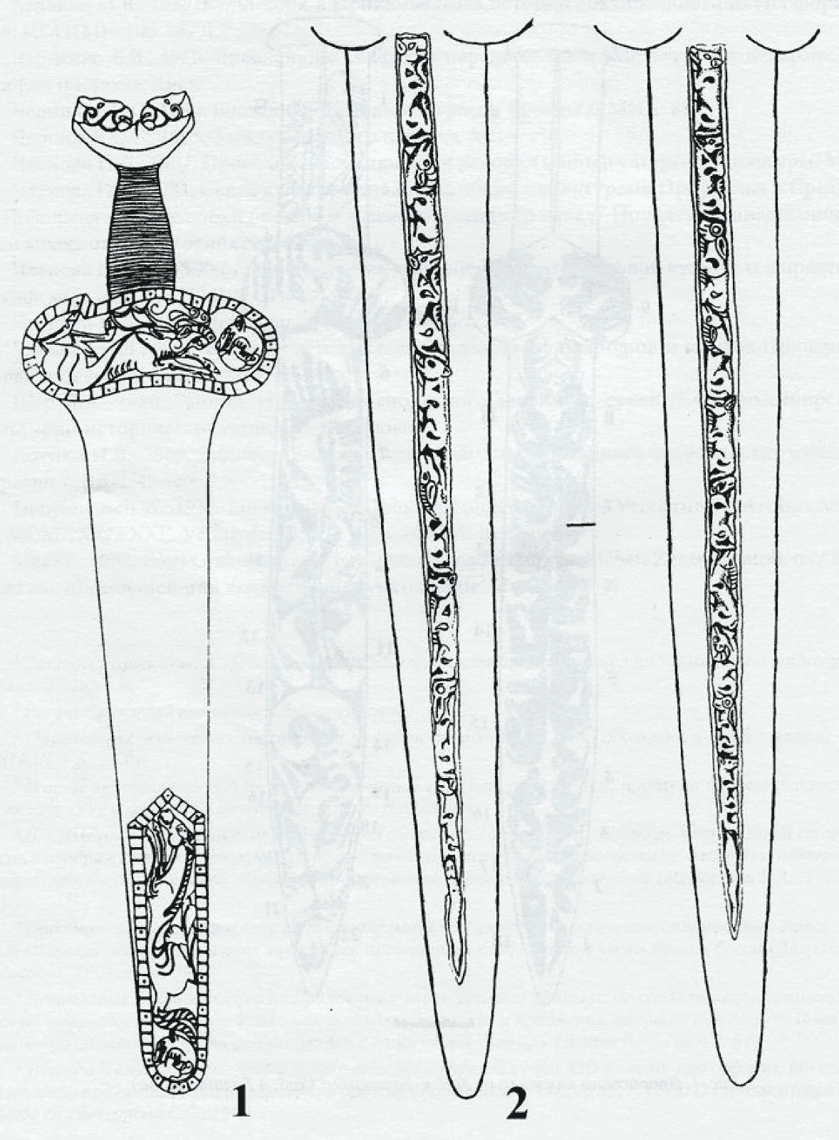 Оба бронзовых кинжала, найденные в Аржане, на первый взгляд, не имеют прямого отношения к скифскому оружию. Навершие одного увенчано фигуркой стоящего кабана, другого – имитирует трехжелобчатые застежки скифо-киммерийского типа. Перекрестья обоих близки друг другу: это узкая, сломанная под тупым углом пластина, заканчивающаяся округлыми выступами на концах, причем в одном случае края перекрестья слегка загнуты вверх (Грязнов М.П., 1980, рис. 11, 1-2, 3-4). Если отвлечься от других деталей и, в первую очередь, от степени массивности сравниваемых вещей, то, в принципе, описанные аржанские гарды (восходящие к карасукским формам), вполне напоминают соответственно бабочковидные и сердцевидные перекрестья скифских мечей и кинжалов, поначалу вообще являвшиеся вариантами одного типа. Такие узкие "протобабочковидные” и "протосердце-видные” перекрестья – отнюдь не редкость на архаическом оружии из Минусинской котловины и Тувы (Членова Н.Л., 1967, табл. 3,13-15, 17,20, 22-28; она же, 1997, рис. 15,2-5; 16,4, и др.). Нагляднее всего процесс эволюции перекрестья типа аржанского в узкобабочковидное среди названных демонстрируют кинжал из с.Биря с навершием в виде стоящего кабана и, особенно, изданный Карлом Йеттмаром кинжал из Минусинского края. Они тождественны аржанскому, но имеют уже измененное на скифский манер перекрестье.