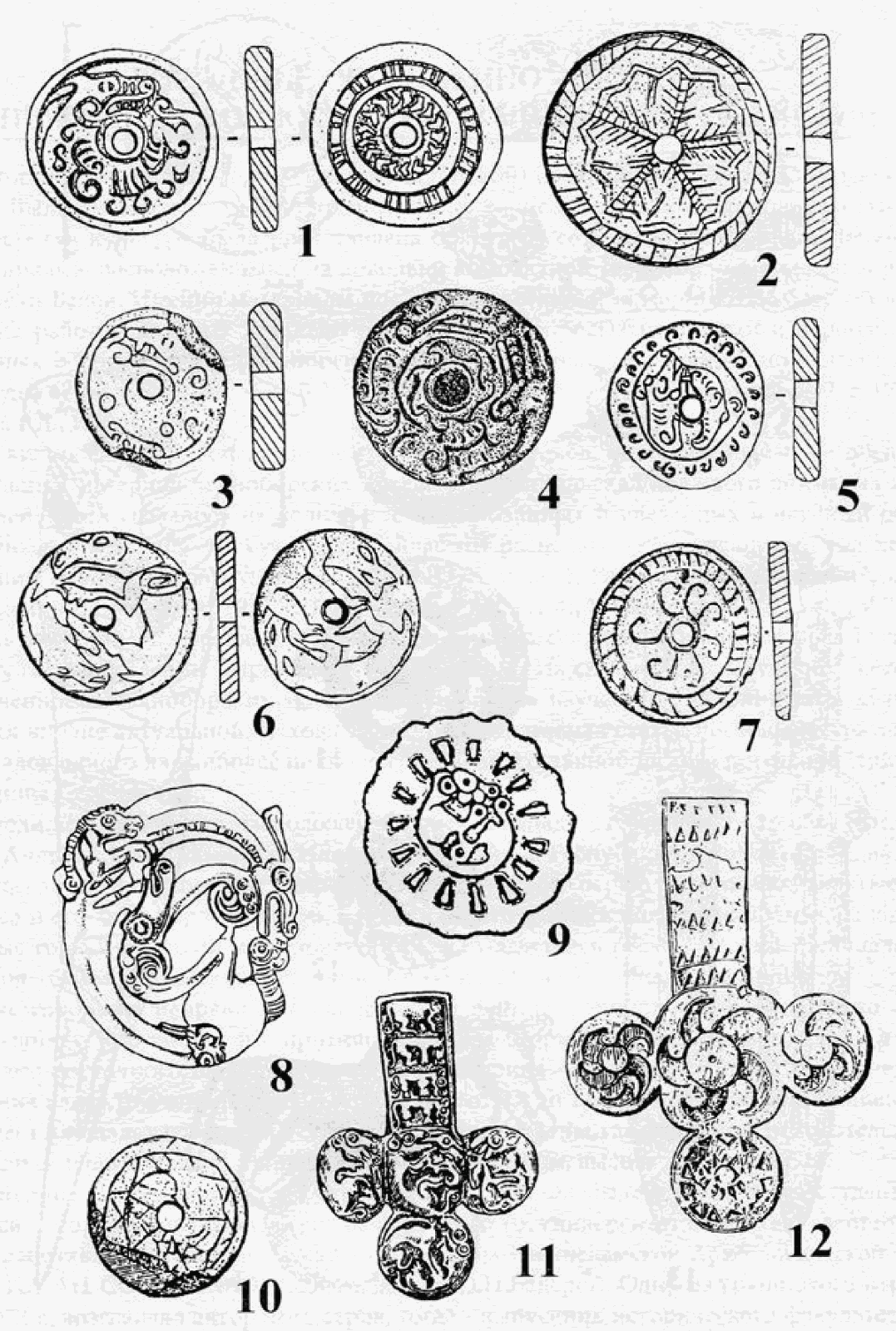 1-7, 10 - пряслице ананьинской общности. 1-2, 6-7 - пряслица с Лргижскаго дородшца (по Голдиной, 1999) и 4 - (по Збруевой. 1952): 3, 5 - пряслица с Буйского городища (по Голдиной, 1999): 8 - бронзовая бляха из кург. из хупк Куликовского (по Раевскому, 1985); 9 - бронзовая бляха из мог. Сакар-Чага-6, кург. 23 (по Полидовичу; 2001): 11 - бронзовая Ольвийская бляха (Ильинская, Тереножкин. 1983) ; 12 - бронзовая бляха из Зуевского могильника (по Збруевой, 1952).