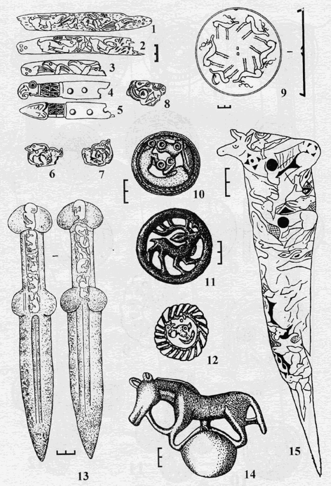 1-7 - костяные изделия из к. 2 Жаботинского могильна ка. 8 - золотая бляха из к. I Жаботинского могильника (по Ильинской, 1975); 9 - бронзовое зеркало из Усть-Бухтармы на Алтае (по Марсадолову, 1982); 10,11,14 - бронзовые бляхи из Айдашинской пещеры (по Молодану и dp., 1980); 12 - бляха из Минусинского края (по Полидовичу, 2001); 13 - бронзовый кинжал из Минусинского края (по Ильинской, 1975); 15 - костяные накладки из Константиновского кургана (по Ильинской, Тереножкину, 1983).