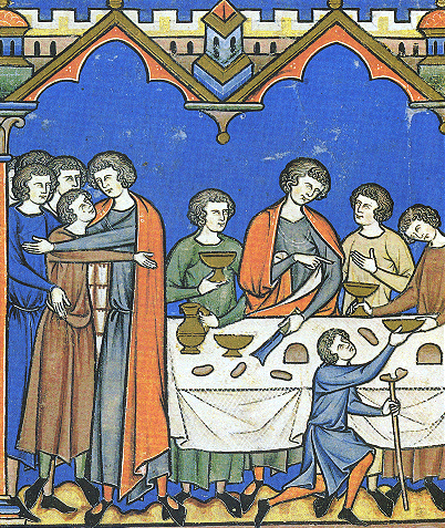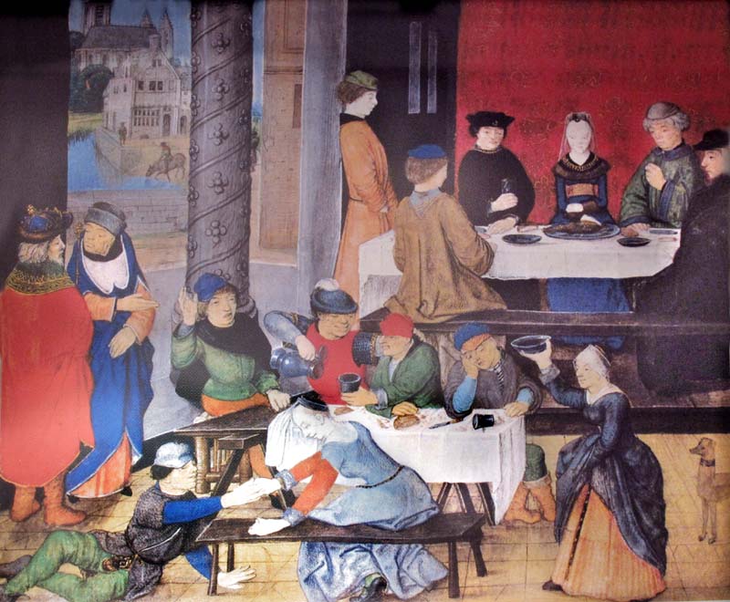| Средневековая передвижная хлебопеч 1465-1475. Большинство печей были естественно стационарными. | Пир в Библии Мациевского (Б. М.1240-1250гг) выглядит очень скромно. То ли особености изображени. То ли в середине 13 века было трудно с едой. |
