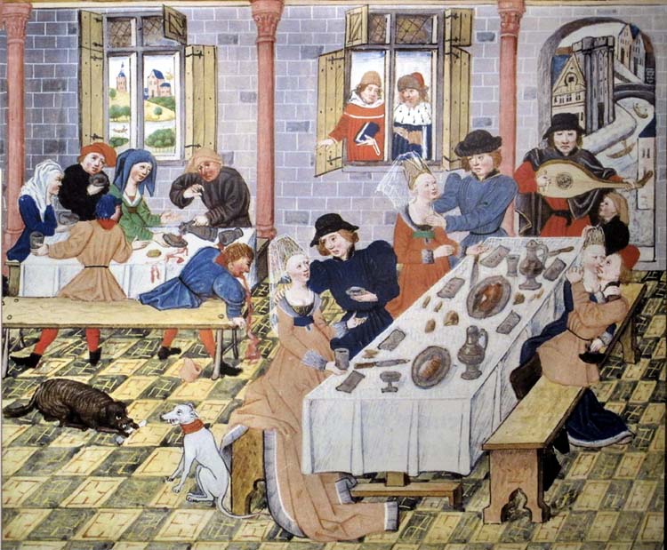 Рацион обычных горожан и крестьян отличался от современного недостаточным содержанием белка. Около 60% рациона (если не больше у отдельных малообеспеченных групп населения) занимали углеводы: хлеб, лепешки, разные каши. Недостаточную питательность пищи компенсировали количеством. Люди наедались лишь тогда, когда переполнялся желудок. А чувство сытости, как правило, ассоциировалось с тяжестью в желудке. Мясо употребляли сравнительно редко, в основном во время праздников. Правда стол знатных сеньоров, духовенства и городской аристократии был весьма обильным и разнообразным.