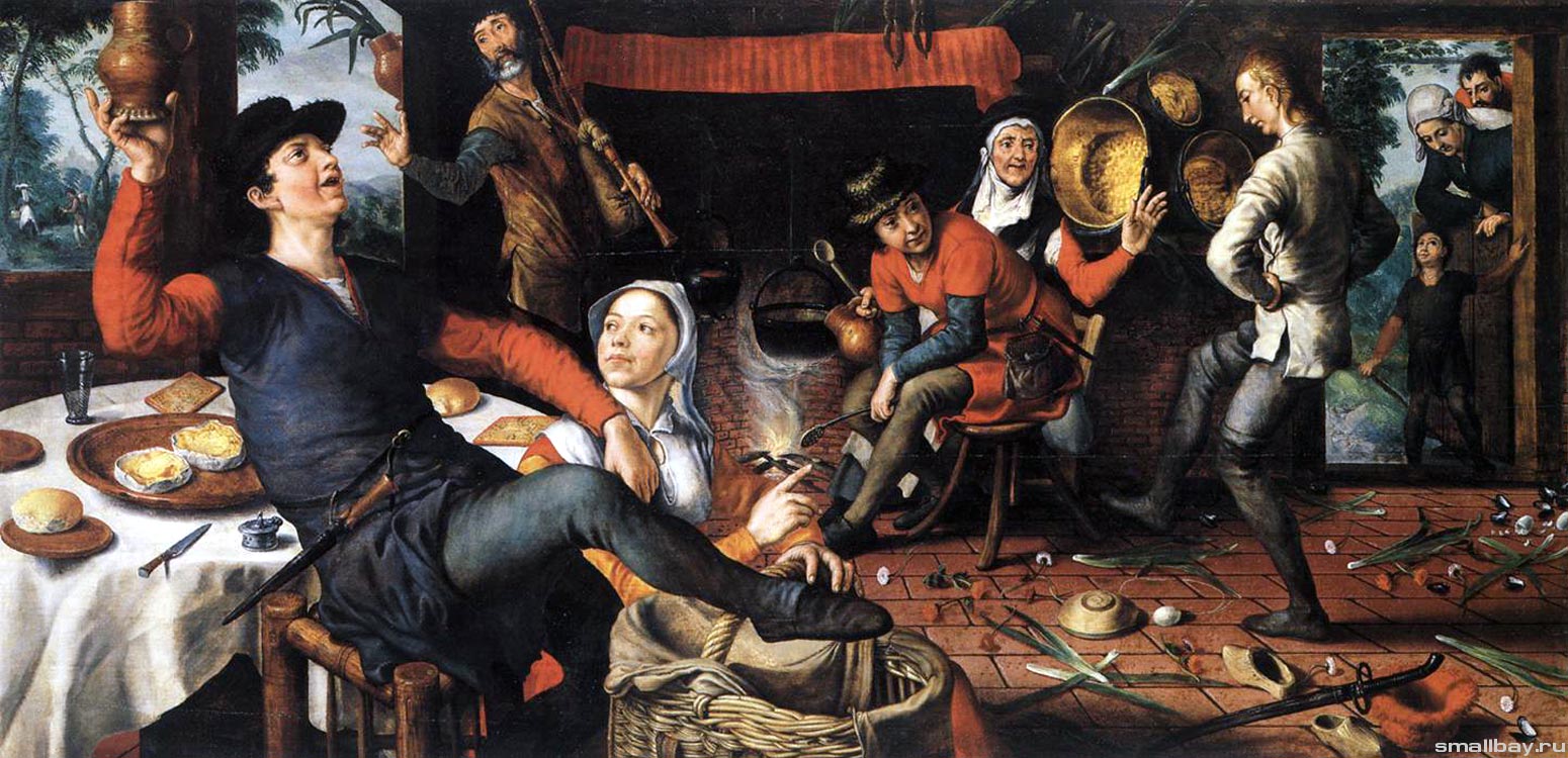 | Танец среди яиц, 1552. худ. Артсен Питер (Aertsen Pieter) | Интерьер кухни из притчи о пире, 1605. Худ. Иоахим Юттеваль (Joachim Wtewael) |