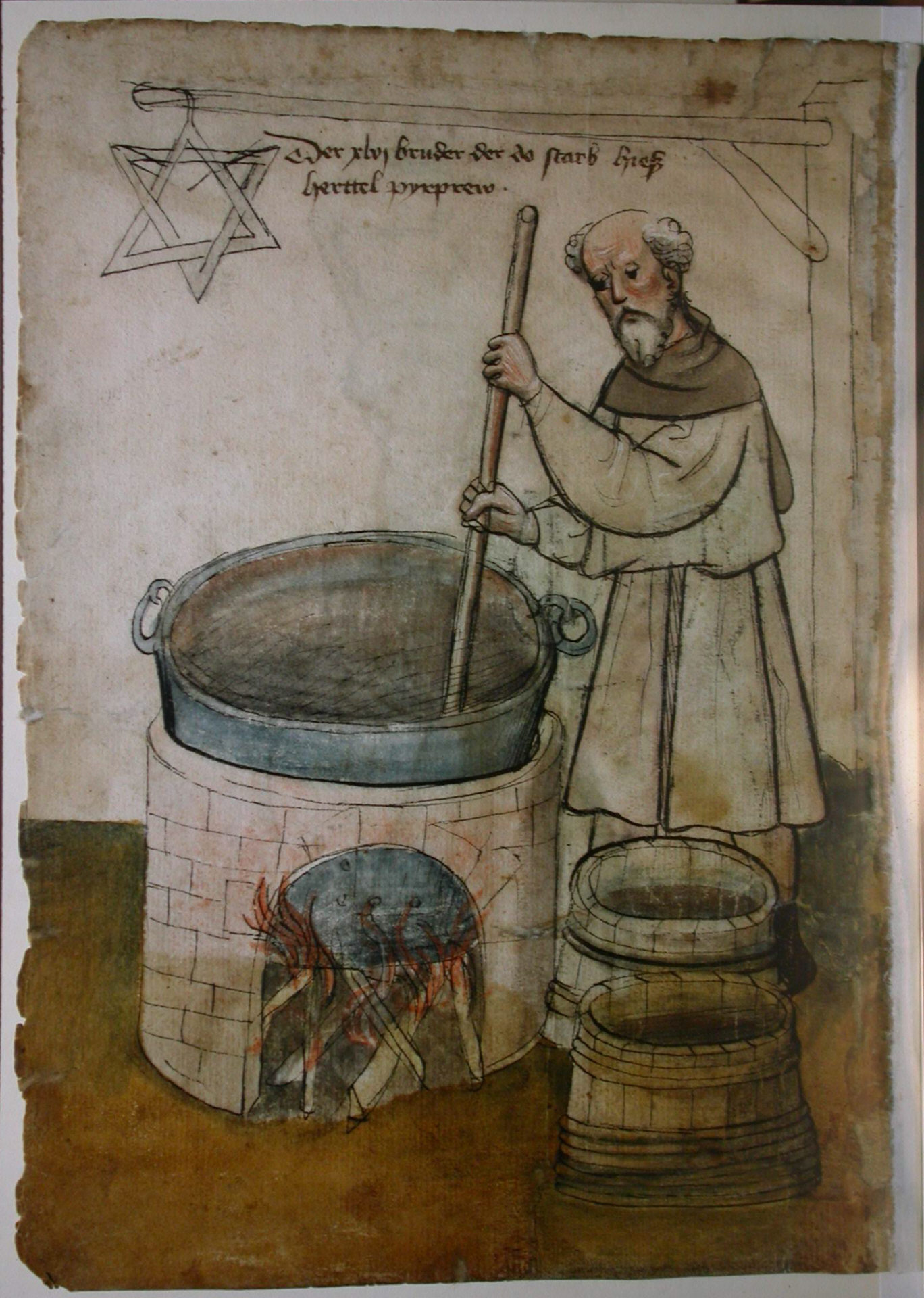 | Давка винограда. Pergola training, 1385 Bologne, Niccolo-student, Forli. Wine in the Middle Ages | Пивовар за работой. the housebook of the brother's endowment of the family Mendel 1425 год. Brauerdarstellungen |