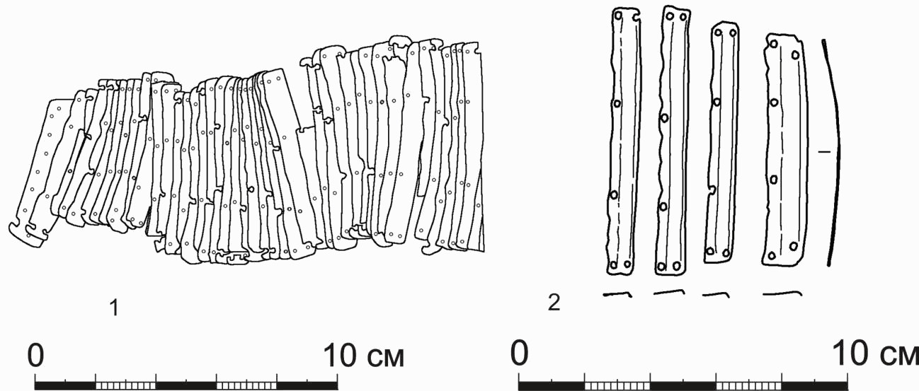 Материалы, происходящие из курганов, исследованных в степях Южного Урала, показывают, что такие пояса не были характерны для культуры кочевников этого региона. В Южном Зауралье известно несколько погребений VII-VI вв. до н.э., содержавших пояса с бронзовыми и железными обоймами прямоугольной формы. Лицевая поверхность этих обойм имеет различное оформление, внутренняя – либо гладкая, либо прорезная [4, с. 140]. Доспехи VI-IV вв. до н.э. долгое время были представлены отдельными фрагментами – «чешуйками» панцирей преимущественно из памятников Поволжья [5, с. 75; 6, с. 52]. Однако при исследовании Филипповского I могильника и некоторых других памятников были получены образцы защитного вооружения, в том числе панцири [7, с. 65-74; 8, 9]. При этом только в кургане 3 Филипповского I могильника была обнаружена часть доспеха, набранная из крупных железных пластин, положение которых позволило предположить, что это была либо пристегивающаяся поясная часть панциря, либо пояс [7, с. 67].
