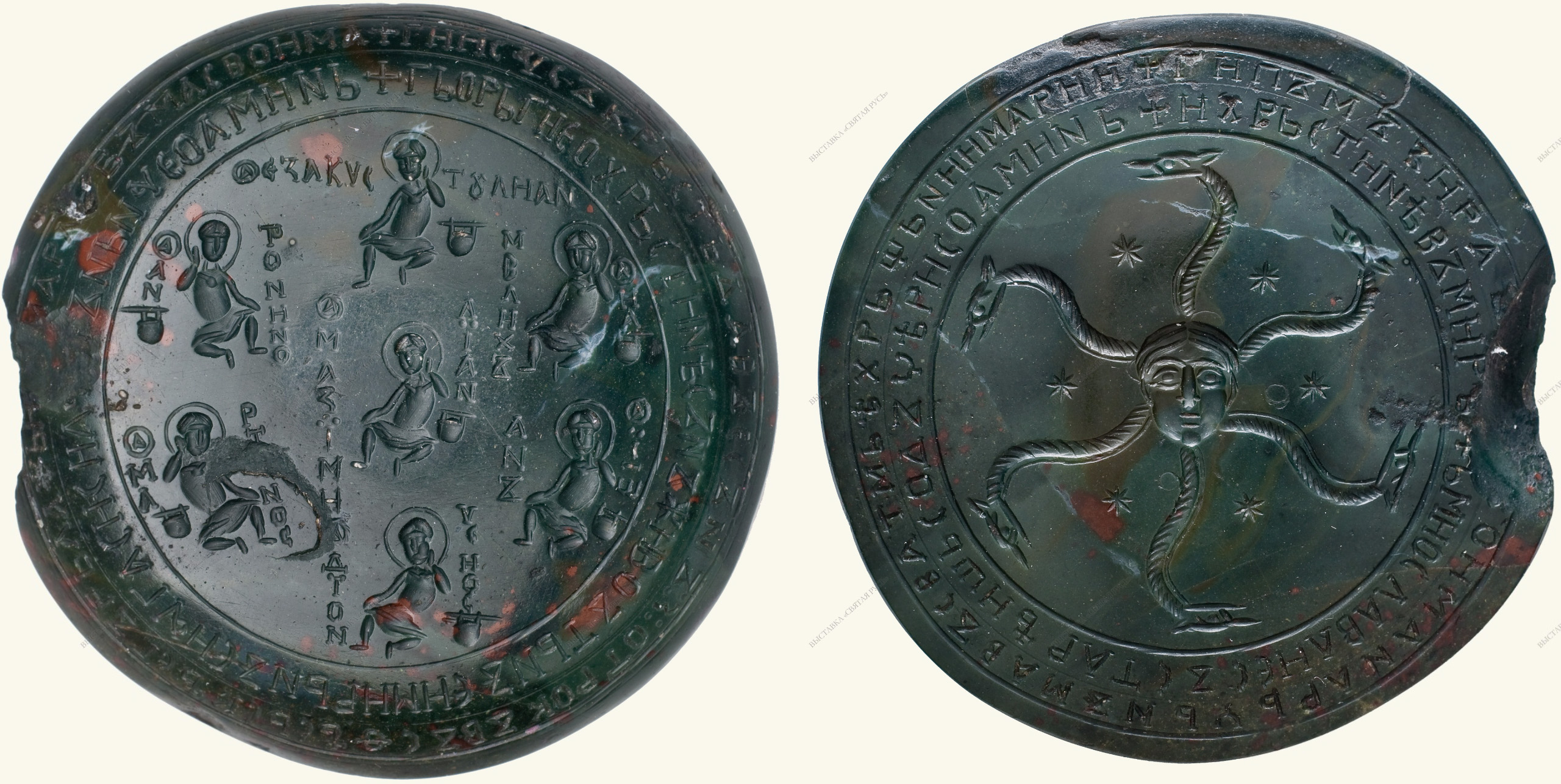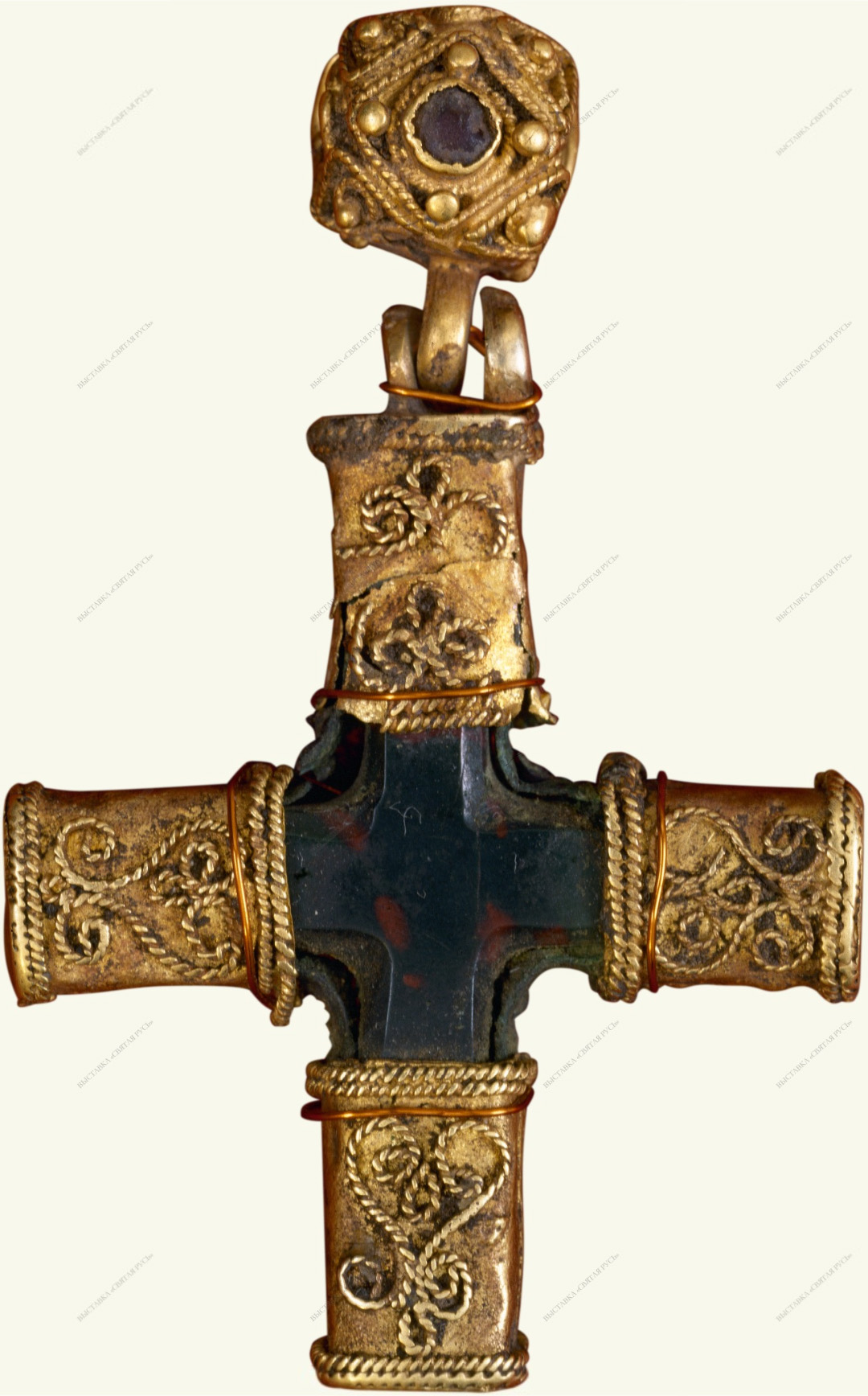 Золото, гранат, гелиотроп; резьба, тиснение, скань, зернь, пайка