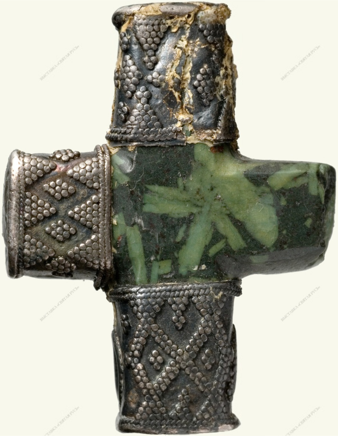 Серебро, серпентин; резьба, тиснение, скань, зернь, пайка