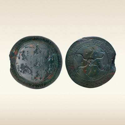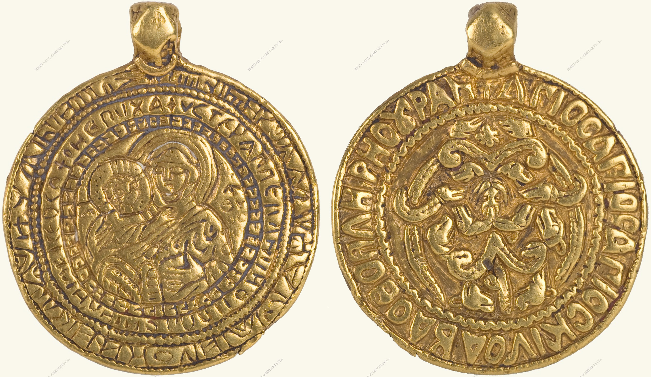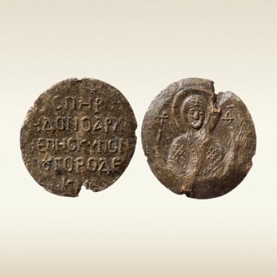 Надписи – на лицевой стороне: + АГ(IA) Θ(EOTOK)Е СКЕ/ПOIC МЕТОN / θΥТHN Нω/ВОГРАД (Пресвятая, воззри на меня, пастыря новгородского); на оборотной стороне фрагмент: О/IO θ/ЕО/Λ(O)Г/О
