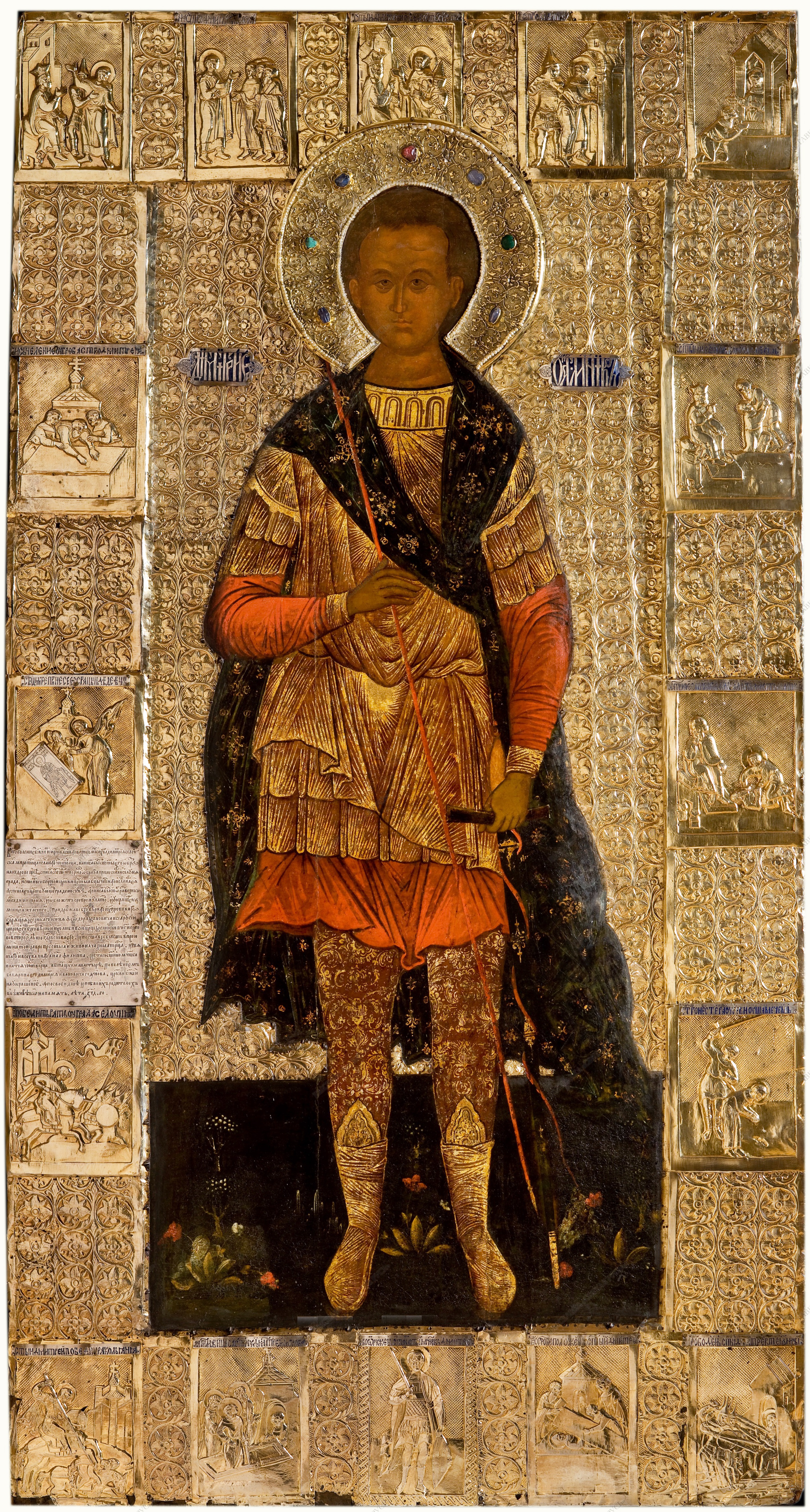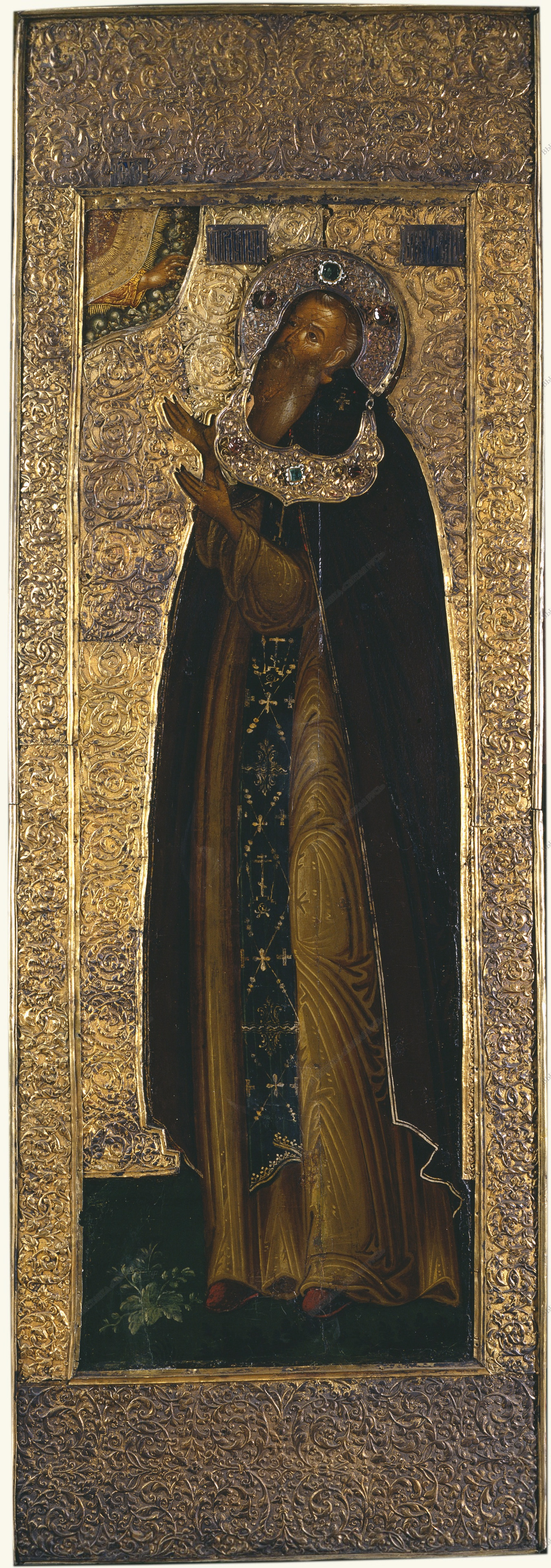 1670–1680-е годы Строгановские мастерские Камка, холст, шелковые, золотные и серебряные нити; шитье 192 х 60,5 Поступил в 1946 году из частного собрания До 1723 года предположительно находился в соборе Рождественского монастыря во Владимире. В 1913 году числился в коллекции Сапожниковых и был похищен с выставки древнерусского искусства, посвященной 300-летию дома Романовых Реставрирован в 1957 году в ГЦХРМ М.П. Рябовой, в 2002 и 2009 годах в СПМЗ Н.Н. Шелонниковой СПМЗ инв. 5552-ихо