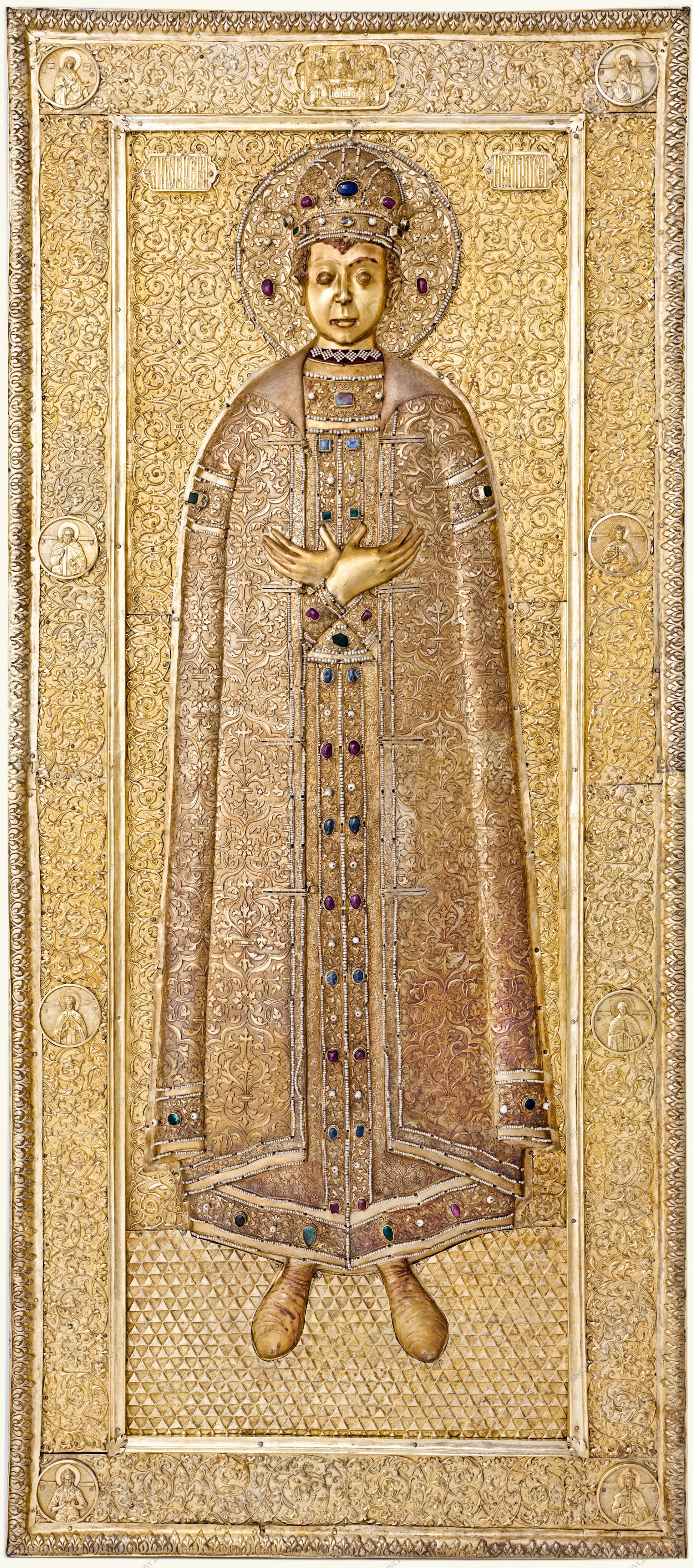 Мастера Павел Алексеев, Дмитрий Алексеев, Василий Коровников, Тимофей Иванов, Василий Малосолец под руководством Гаврилы Овдокимова 1628–1630 годы Мастерские Московского Кремля Золото, серебро, драгоценные камни, жемчуг, стекло, дерево, ткань; чеканка, литье, резьба, канфарение, золочение, эмаль 158,3 х 70,3 Происходит из Архангельского собора Московского Кремля Реставрирована в 1985 году Н.И. Долговым ММК инв. МР-9989