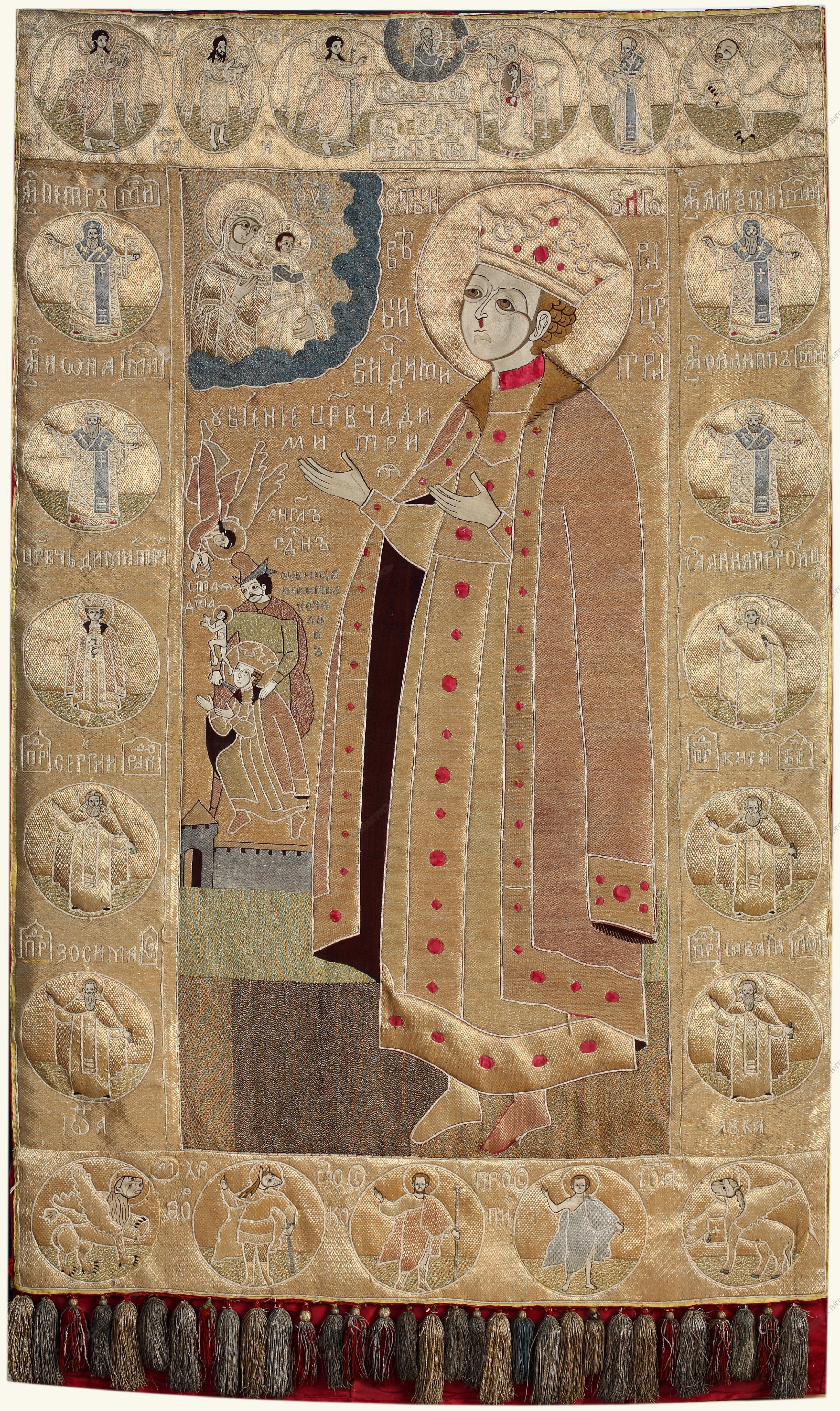 1654 год Анна Ивановна Строганова и инокиня Марфа Веселка. Сольвычегодск Объярь, камка, холст; шелковые, серебряные и золотные нити; шитье 140 х 89 Поступила в 1919 году На подкладке надпись: ЛЕТА 7163 ‹1654› ГОДУ ОКТЯБРЯ В 19 ДН СОВЕРШЕНА БЫСТЬ СИЯ ПЕЛЕНА К ОБРАЗУ СТГО БЛГОВЕРНАГО ЦРВИЧА ВЕЛИКАГО КНЗЯ ДИМИТРИЯ МОСКОВСКАГО И ВСЕЯ РУСИ И ЧЮДОТВОРЦА ЧТО СТОИТ ОУ СОЛИ ВЫЧЕГОЦКОЙ В СОБОРНОЙ ЦРКВИ БЛАГОВЕЩЕНИЯ ПРСТЫЯ БДЦЫ ПО ОБЕЩАНИЮ ИМЕНИТАГО ЧЛКА ДИМИТРИЯ АНДРЕЕВИЧА СТРОГАНОВА А ТРУДЫ И ТЩАНИЕ СИЯ ПЕЛЕНА ЖЕМЧЮГОМ ЖЕНА ЕГО ДИМИТРИЯ АНДРЕЕВИЧА АННА ИВАНОВНА А В ЛИЦАХЪ И В РИЗАХ И ВО ВСЯКОЙ ОУТВАРИ ТРУДЫ ИНОКИ МАРФЫ ПО РЕКЛУ ВЕСЕЛКИ Вклад Дмитрия Андреевича Строганова в сольвычегодский Благовещенский собор СИХМ инв. 618-пр