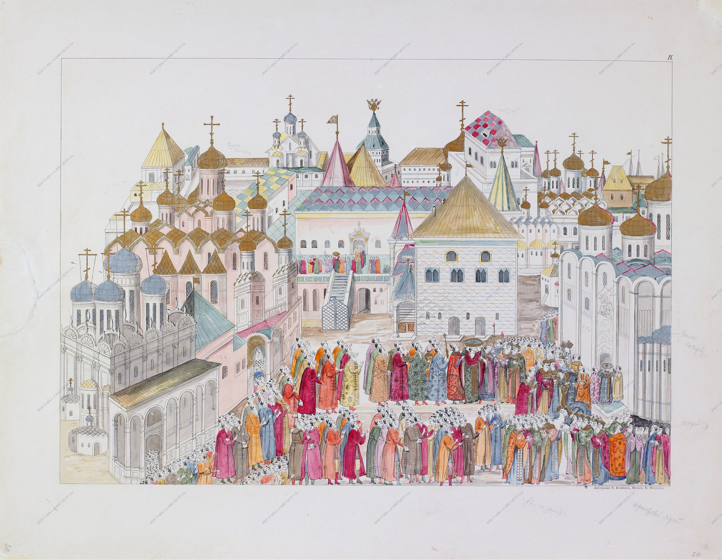 Лист из книги «Рисунки, принадлежащие к книге “Об избрании на царство царя Михаила Федоровича”» (лист 22, рис. X) Литография В. Кудинова, раскраска – А.А. Потапов, 1898 год 1856 год Москва Бумага; литография, акварель, твореные золото и серебро, тушь, карандаш 64 х 76 Поступил в 1981 году из библиотеки Оружейной палаты ММК инв. Кн-250