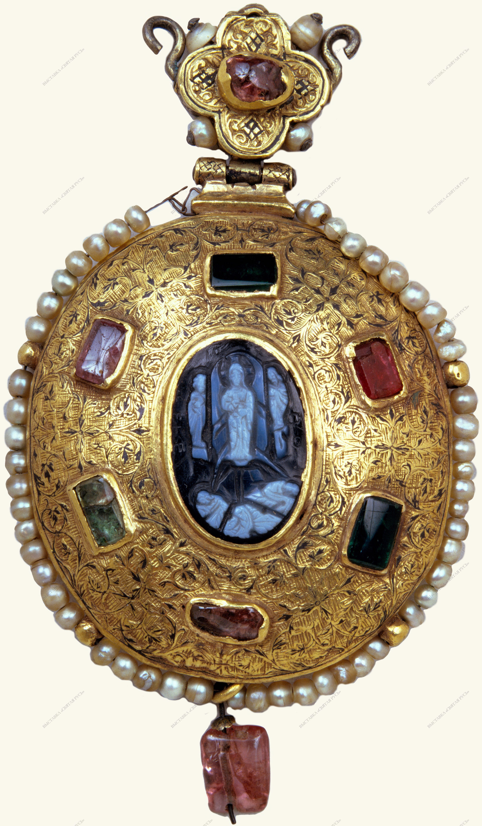 Камея – XIII век. Итало-византийский круг. Панагия (оправа) – 1592 год. Дверца на обороте – вторая половина XVII века Москва, Мастерские Московского Кремля Сардоникс, золото, серебро, изумруды, рубин, шпинели, берилл, жемчуг; резьба, чернь, гравировка 11,6 х 6,6 Поступила в 1924 году В первой половине XVII века принадлежала патриарху Филарету Романову; позднее хранилась в архиерейской ризнице в городе Коломне. В 1799 году перемещена в архиерейскую ризницу вновь учрежденной епархии в городе Туле, откуда в конце XIX века была украдена. В начале XX века находилась в частных коллекциях – А.К. Ечкина в Москве, М. Савостина в Санкт-Петербурге. У последнего была в 1911 году приобретена для музея ЦУТР барона Штиглица ГЭ инв. w-1216