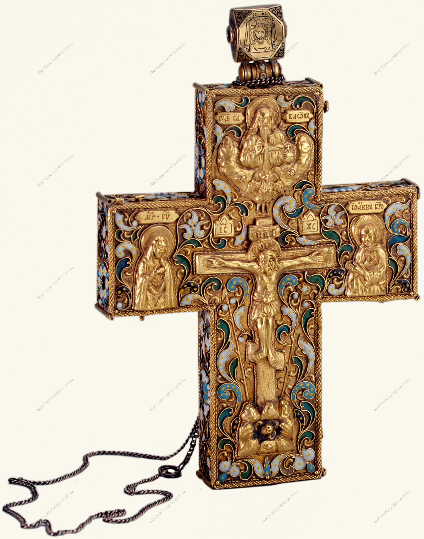 Первая половина XVII века (1606–1619 ?) Золото, дерево; перегородчатая эмаль 15,9 х 10,6 х 1,8 Поступил в 1956 году На обороте – гравированная надпись XIX века, согласно которой патриарх Филарет (Федор Никитич Романов), находясь в польском плену, благословил этим крестом боярина А.В. Волынского. Хранился в Александровском дворце в Царском Селе, затем в Павловском дворце-музее ГЭ инв. ЭРП-1303