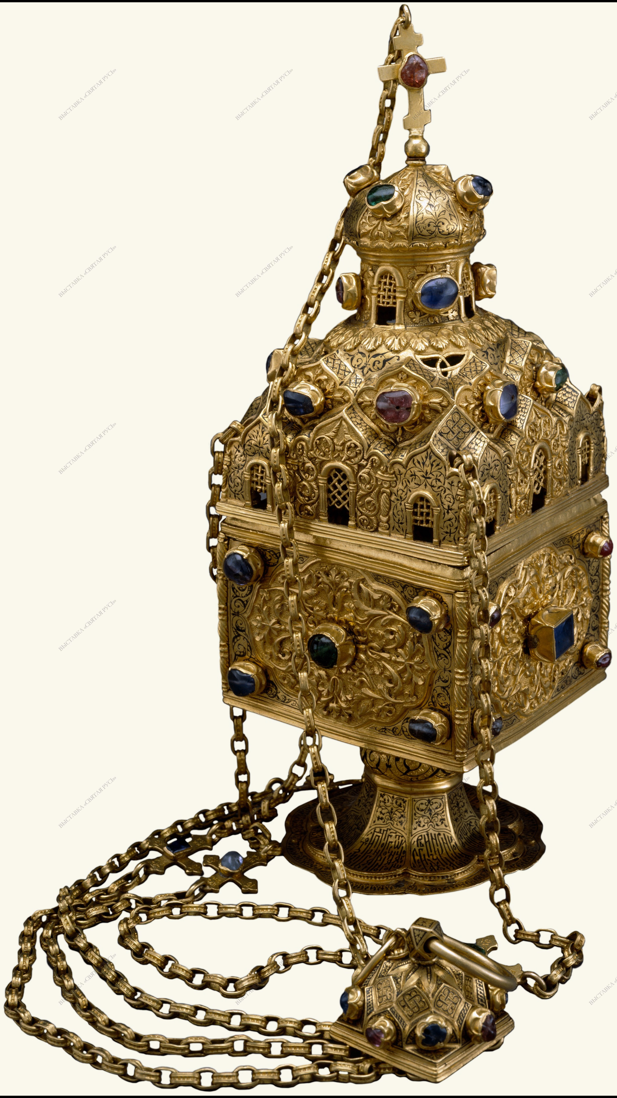 Мастера Третьяк Пестриков и Даниил Осипов 1616 год Москва, Мастерские Московского Кремля Золото, сапфиры, турмалины, изумруды; чеканка, чернь, пунцирование, резьба Высота – 31,5; ширина основания – 11 Поступило в 1928 году На поддоне, в клеймах, черневая надпись: ЛЕТА 7124 ‹1616› ГОДУ МАЯ В 19 ДЕНЬ / ПОВЕЛЕНИЕМ ВЕЛИКОГО ГОСУДАРЯ / Ц‹А›РЯ И В‹ЕЛИ›КОГО КНЯЗЯ МИХАИЛА ФЕДОРОВИЧА ВСЕЯ РУССИИ САМОДЕРЖЦА В ЧЕТВЕРТОЕ ЛЕТО ГОСУДАРСТВА ЕГО / ЗДЕЛАНО СИЕ КАДИЛО В ДОМ ЖИВОНАЧАЛЬ НЫЕ / ТРОИЦЫ И ПРЕПОДОБНОГО БОГОНОСНОГО ОТЦА НАШЕГО / СЕРГИЯ И УЧЕНИКА ЕГО НИКОНА / РАДОНЕЖСКИХ ЧУДОТВОРЦЕВ Вклад царя Михаила Федоровича в Троице-Сергиев монастырь ММК инв. МР-1074
