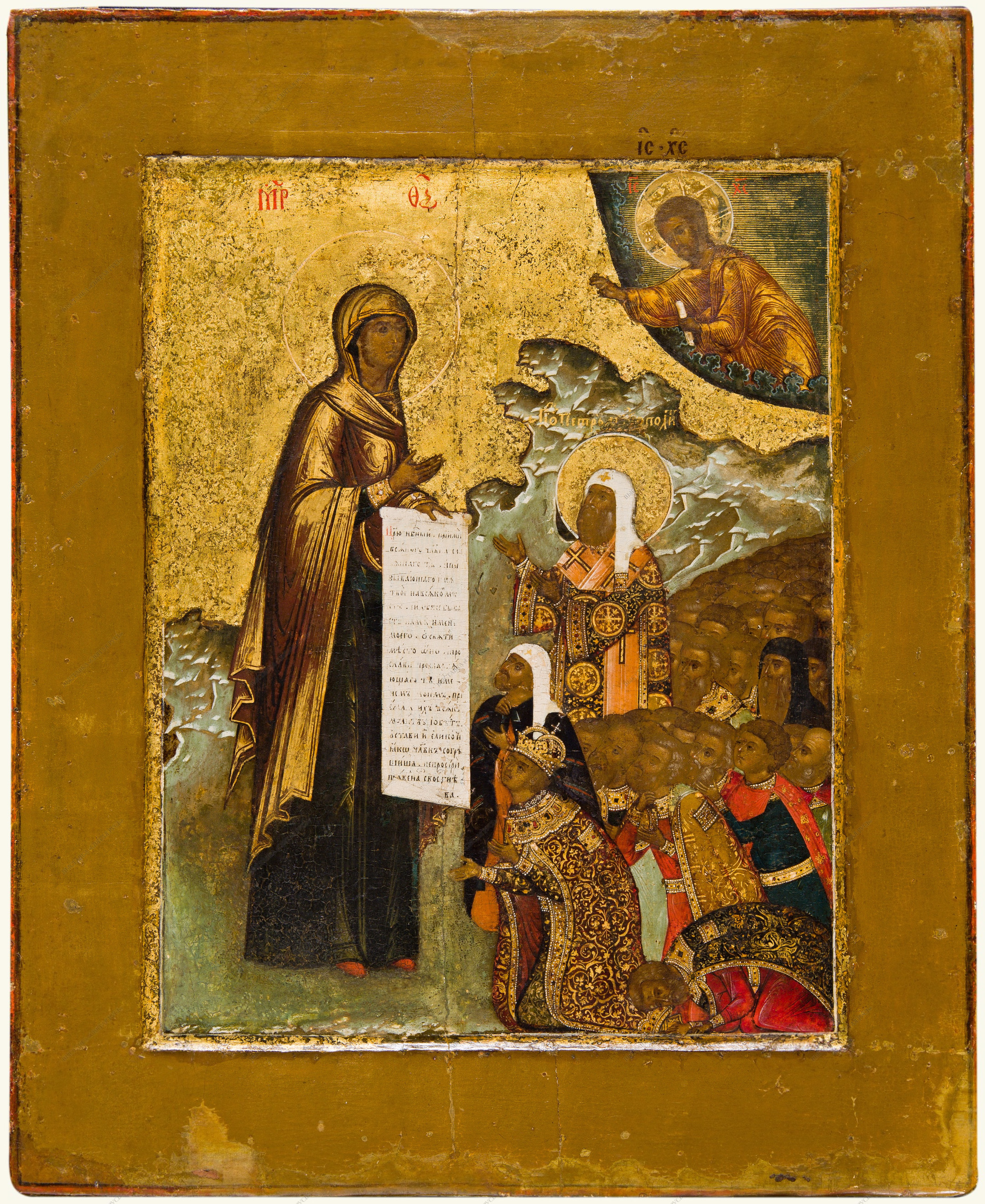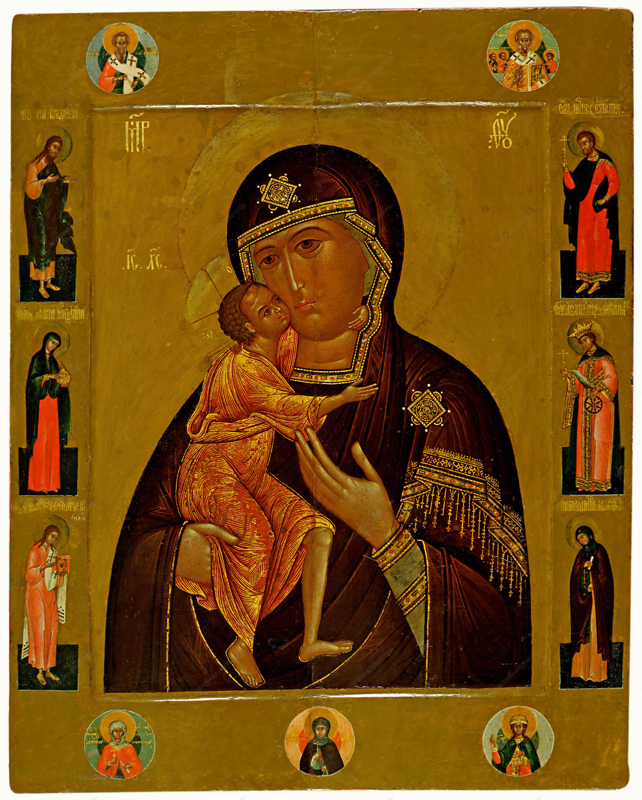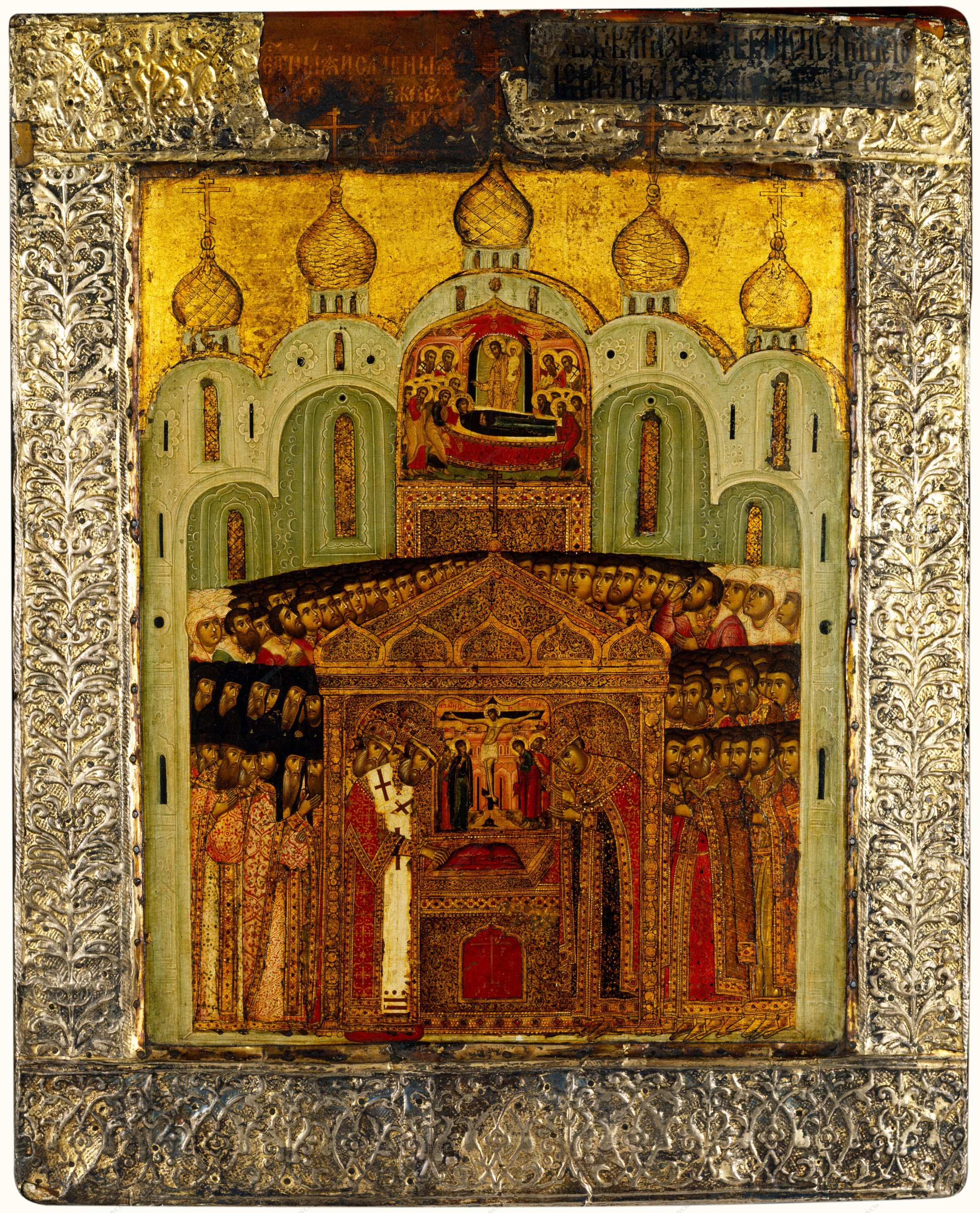 1586 год Москва Дерево; темпера; оклад – серебро, сапфиры, шпинель, бирюза, стекло, перламутр, жемчуг; басма, чеканка, канфарение, золочение, чернение, резьба, эмаль 162 х 88 Поступила из музея Костромы в 1933 году Вклад 1586 года в Костромской Ипатьевский монастырь Дмитрия Ивановича Годунова – именитого боярина и воеводы, дяди будущего «выборного» царя Бориса Годунова ГИМ инв. 75304 ОК 9106