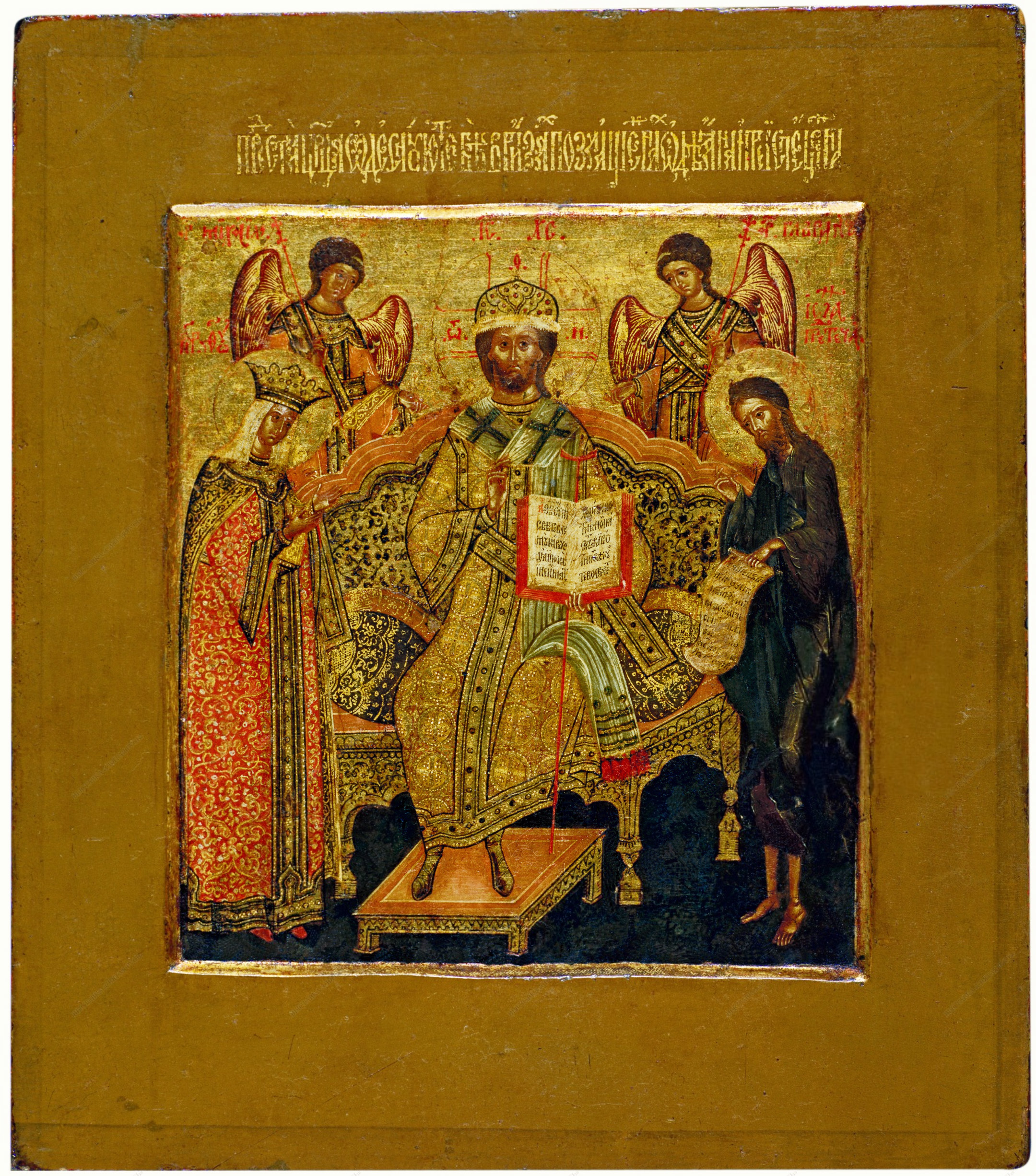 Третья четверть XVI века Москва Дерево; темпера 214,3 х 163 Поступила в 1894 году Происходит из Архангельского собора Московского Кремля, где, по-видимому, первоначально находилась справа от местного ряда иконостаса, на южной стене «над гробом» Василия III Реставрировалась неоднократно: в 1679 году и на рубеже XVII–XVIII веков поновлялась полностью; в XVIII веке и несколько раз в XIX веке частичнопо; раскрывалась в 1997 году в ВХНРЦ им. И.Э. Грабаря А.А. Горматюком и В.В. Занозиным ГИМ инв. 29172 И-VIII 3423